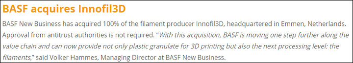 Le géant de la chimie (le plus grand groupe au monde) vient de racheter le fabricant de filaments Innofil3D. Avec cette acquisition de 100% de l’entreprise néerlandaise, BASF pourra proposer d’autres matières d’impression que le traditionnel plastique PLA et ABS. Les solutions d’impression 3D BASF seront développées à Heidelberg (Allemagne) mais Innofil3D conservera ses bureaux aux Pays-Bas.
