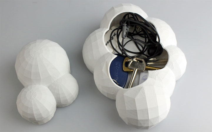 Quand on veut ranger autre chose que des fichiers informatiques dans le cloud, on imprime ce joli nuage pour y placer des bijoux, des clés, des écouteurs… Fichier STL à télécharger ici.