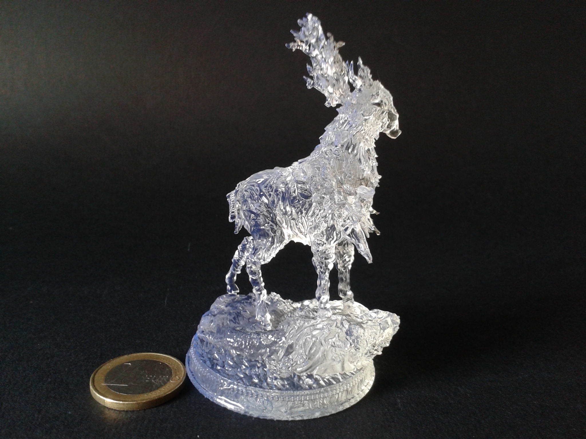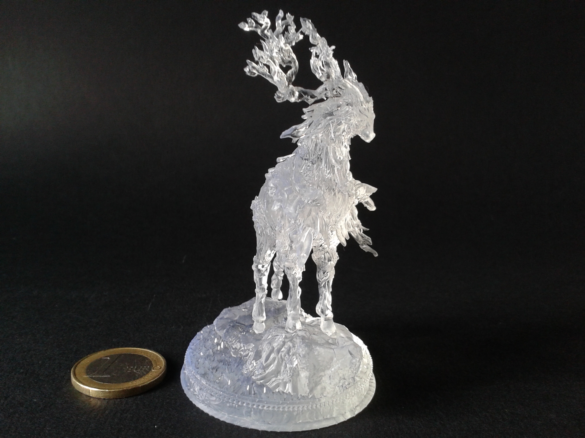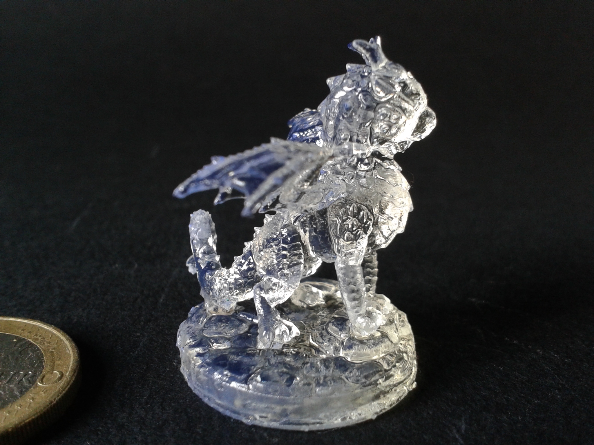 Pour obtenir un bel effet de transparence, cette résine demande une étape de plus pour le post-traitement d’impression. Il s’agit, d’appliquer une fine couche de cette résine au pinceau avant le post-traitement de durcissement aux UV (le “Cure”), ou une couche de vernis transparent brillant après le “Cure”. Il y a donc une perte des très petits détails d’impression sur le résultat obtenu.