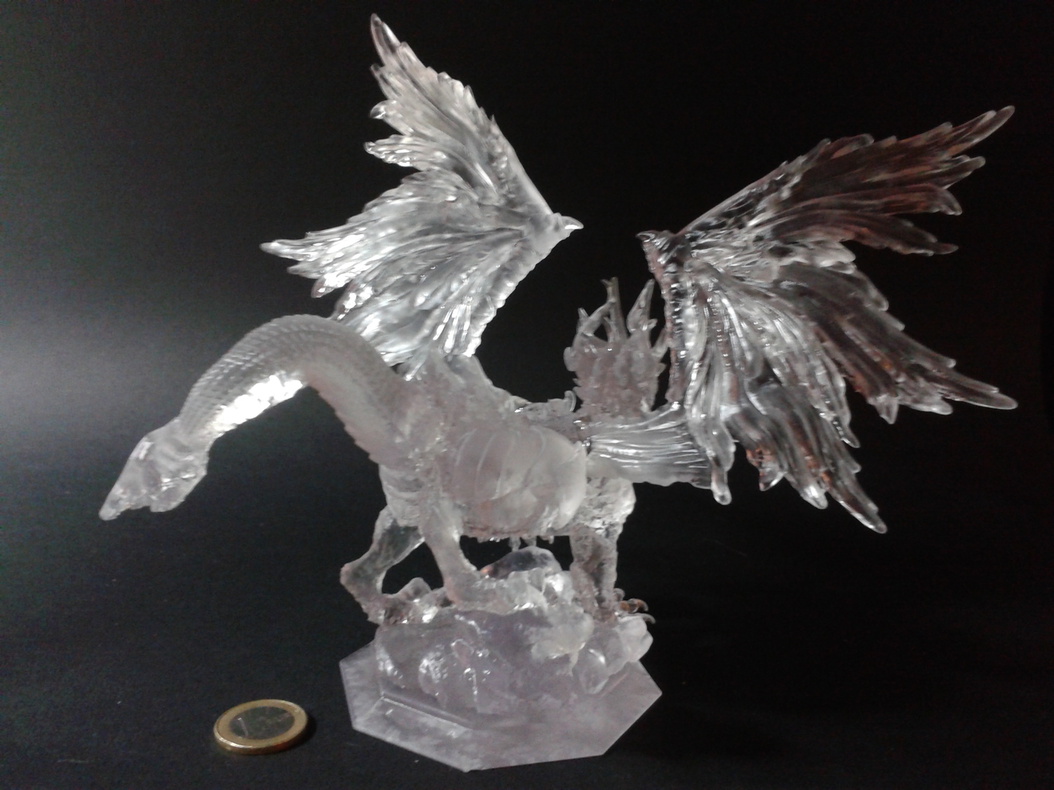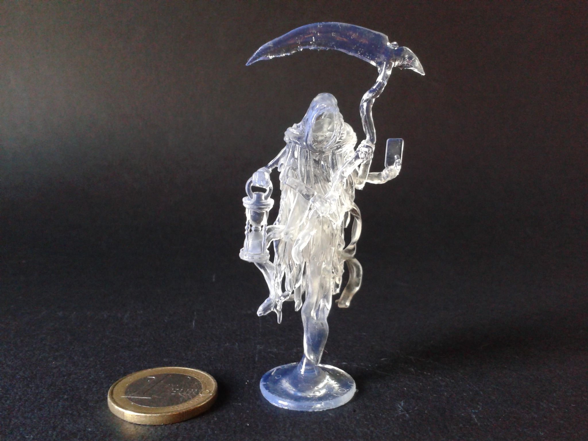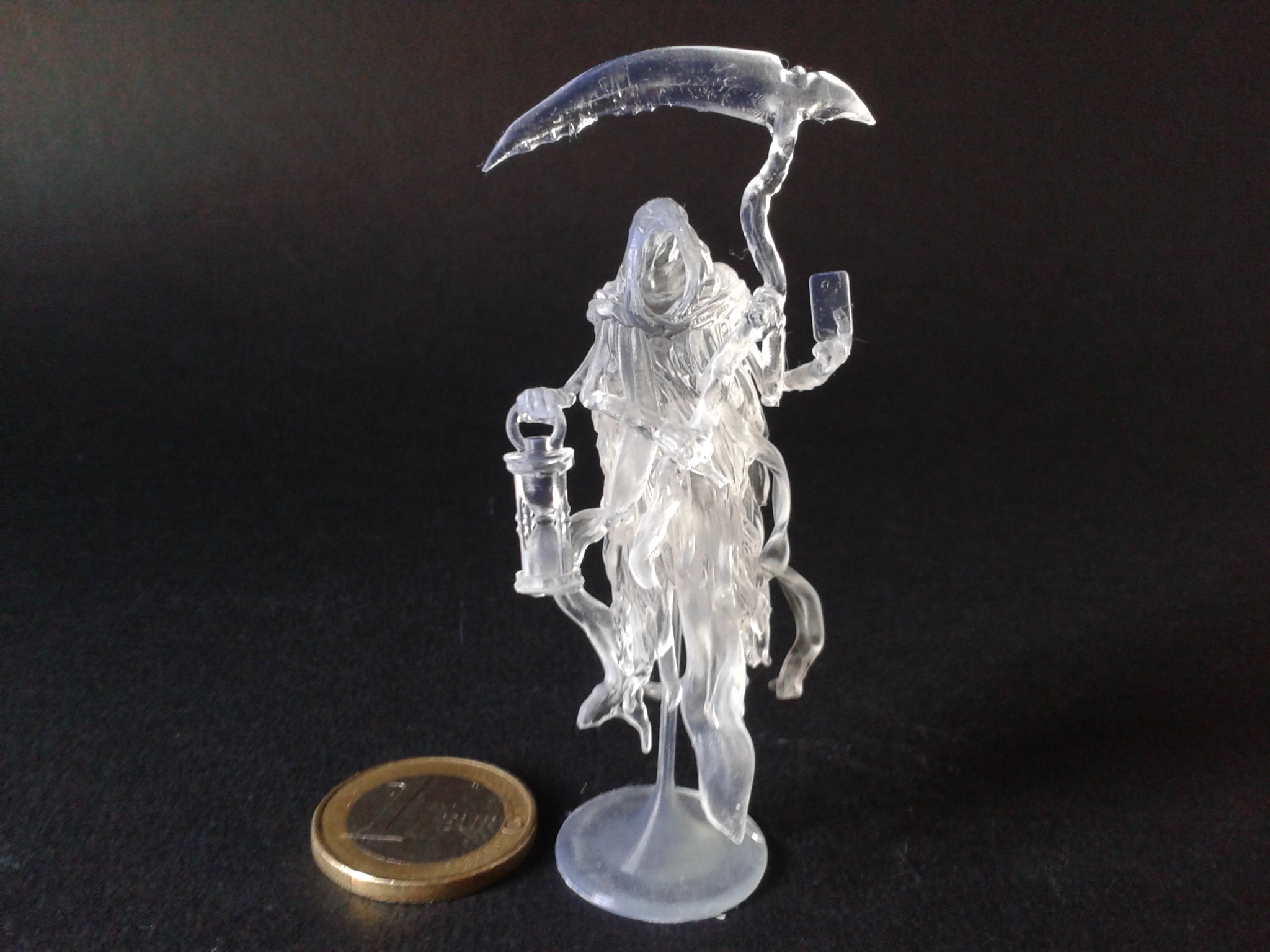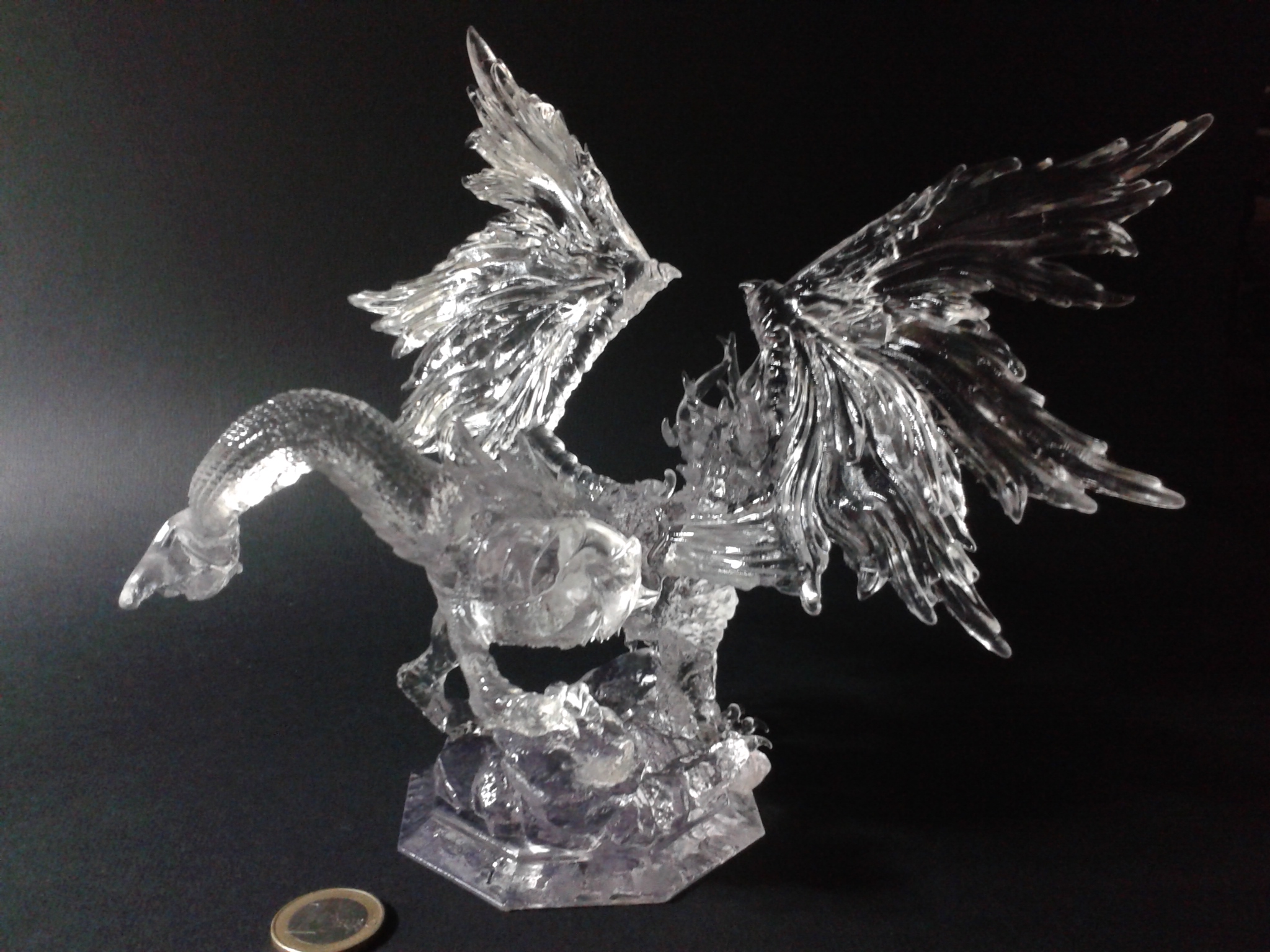 Pour obtenir un bel effet de transparence, cette résine demande une étape de plus pour le post-traitement d’impression. Il s’agit, d’appliquer une fine couche de cette résine au pinceau avant le post-traitement de durcissement aux UV (le “Cure”), ou une couche de vernis transparent brillant après le “Cure”. Il y a donc une perte des très petits détails d’impression sur le résultat obtenu.