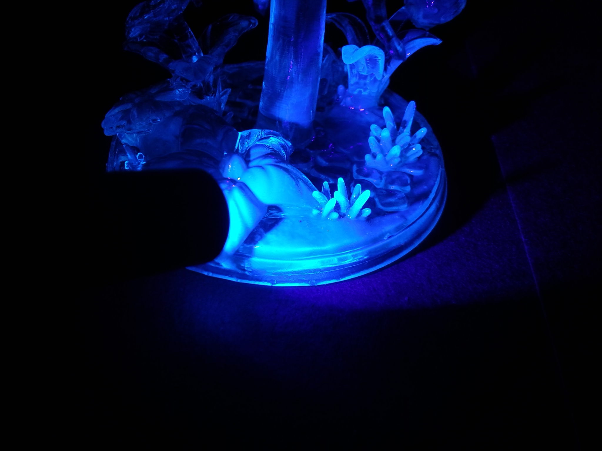 Pour le retrait des supports d’impression après un “Wash”, une source de lumière UV comme une torche LED UV, par exemple le Cure Beam de Phrozen, peut aider à mieux distinguer certains petits détails et bouts de supports difficiles à voir du fait de la transparence de la résine.