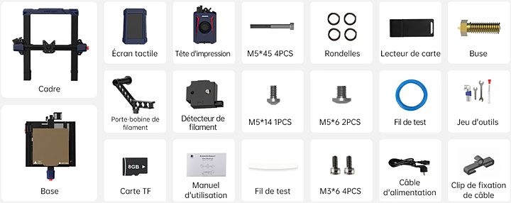 Le contenu complet du carton est listé ci-desssous, le filament ne servira guère qu’à imprimer un ou deux objets de test.