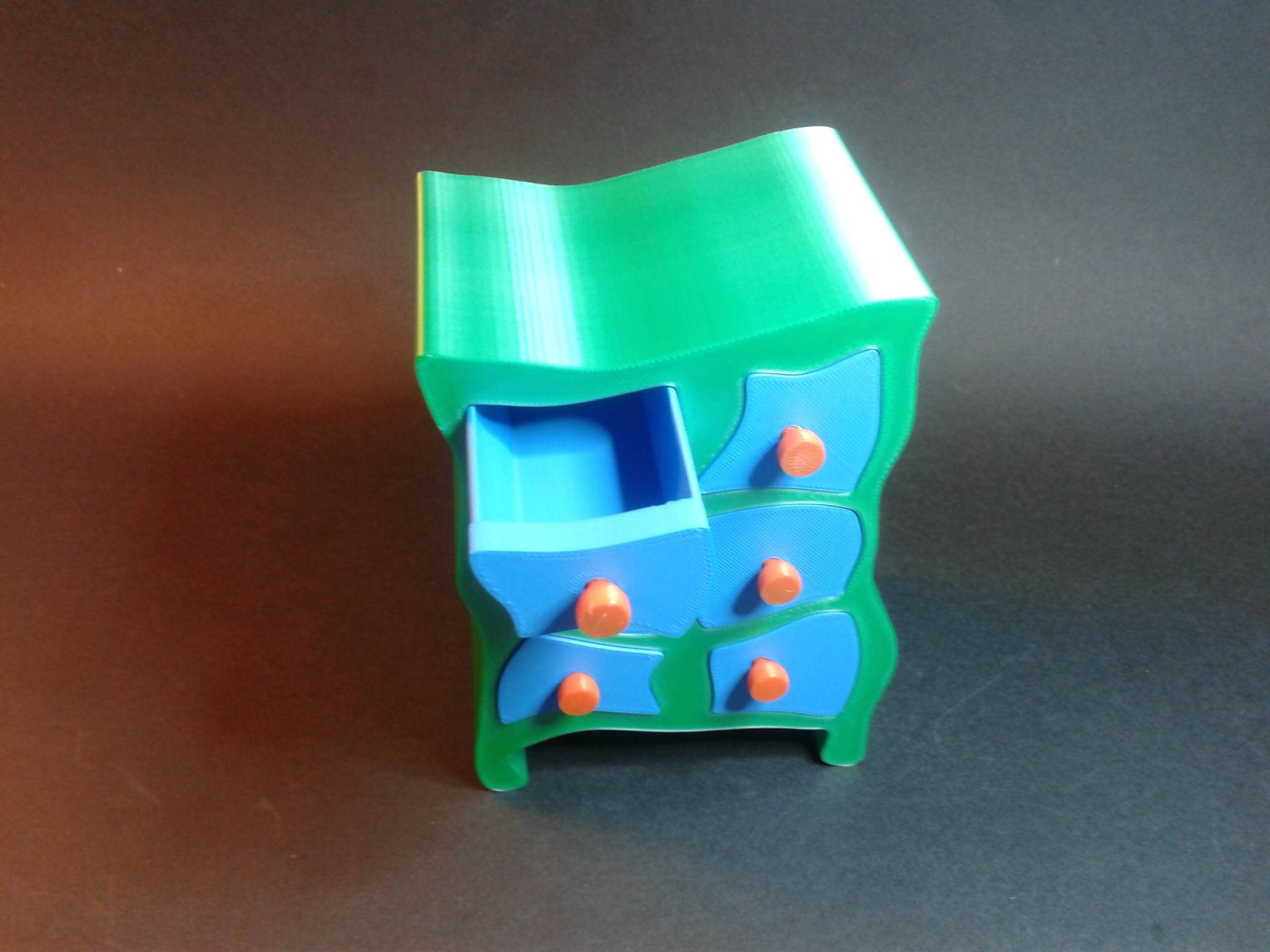“Wonkey Chest of Drawers” en deux impressions (le corps du meuble, puis les tiroirs), filaments PLA Silk Vert ArianePlast et Anycubic PLA-Silk Metal Blue, durée d’impression cumulé, environ 6h06 :