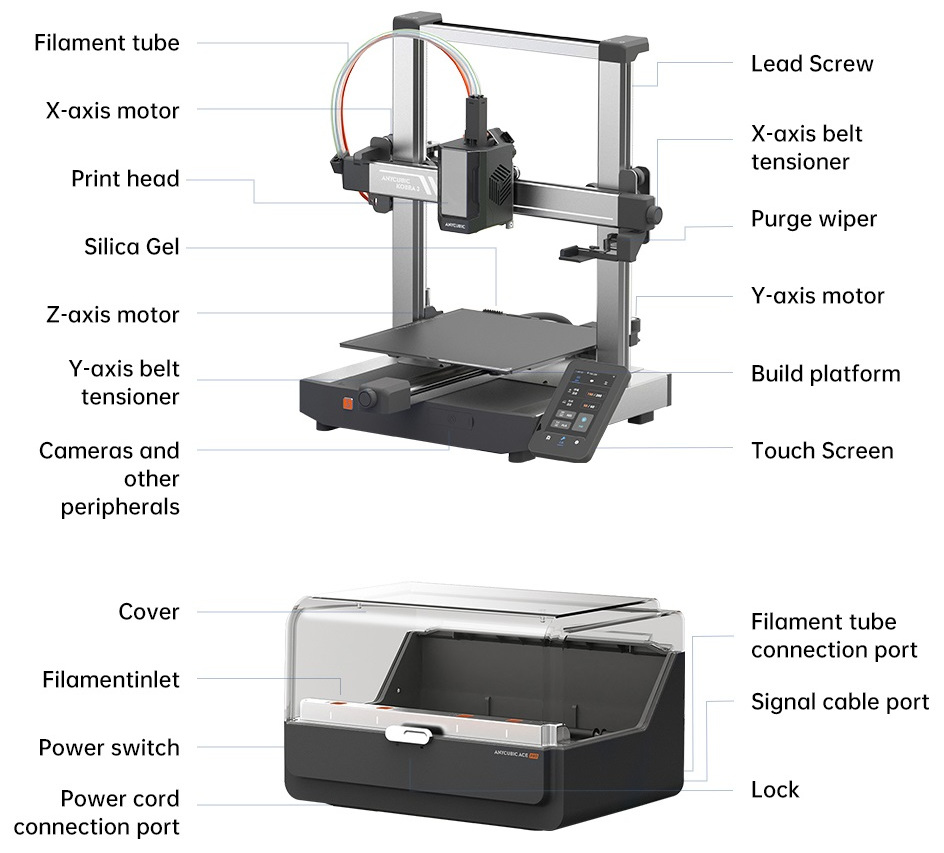 | Impression multi couleurs | Oui, jusqu’à 4 couleurs si ACE Pro connecté (maximum de 8 couleurs si un second ACE Pro est connecté mais nécessite un “HubPro” pour connecter les 8 sorties filaments des deux ACE Pro à la tête d’impression, HubPro qui n’est pas encore disponible, mais qui le sera normalement avant fin 2024) |