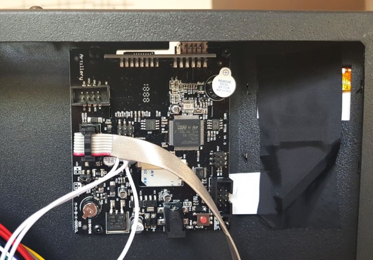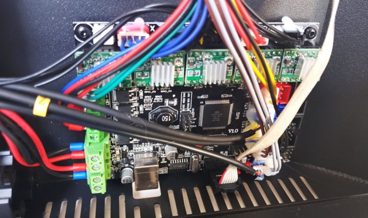 Cachés sous le châssis, on retrouve une carte mère MKS Gen L (flashée sous Marlin 1.9) avec un processeur ATMega 2560 et des drivers AT2100 “maison” très silencieux. La carte de l’écran est reliée à ce dernier par une nappe et un régulateur connectée à l’alimentation 220V.