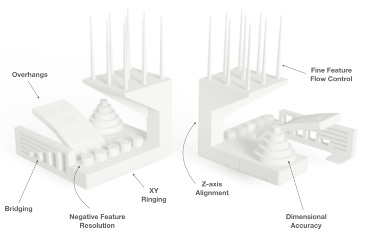 Pour évaluer les performances de l’imprimante 3D, rien de mieux qu’un bon gros torture test développé par Autodesk pour Kickstarter. Une version STL est disponible sur Thingiverse.