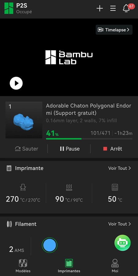 L’application mobile Bambu Handy (Android et iOS / iPhone) est vraiment pratique et très complète. Elle permet non seulement de lancer des impressions en sélectionnant les modèles depuis MakerWorld, mais elle permet aussi de suivre les impressions à distance tout en pouvant modifier les réglages.