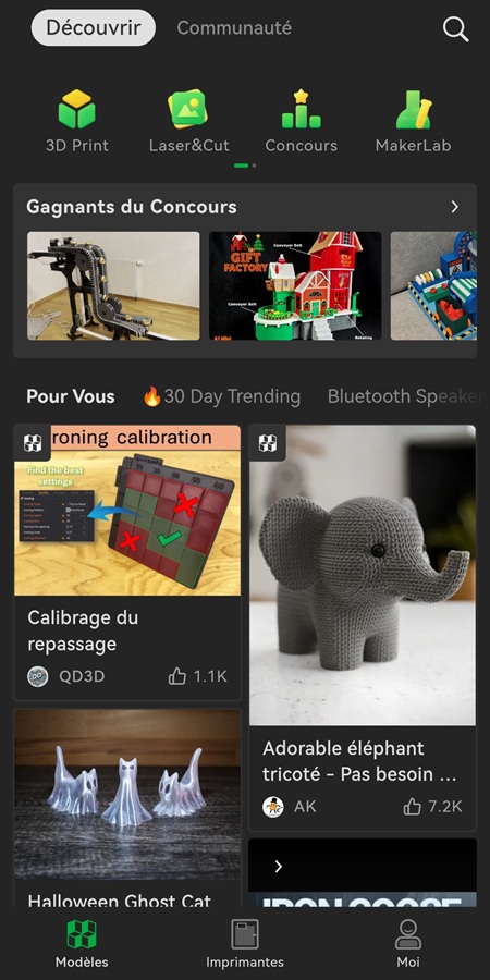 C’est pour ma part l’écosystème le plus performant à l’heure actuelle. Il est composé du trancheur Bambu Studio, de l’application Bambu Handy et de la bibliothèque de modèles MakerWorld.