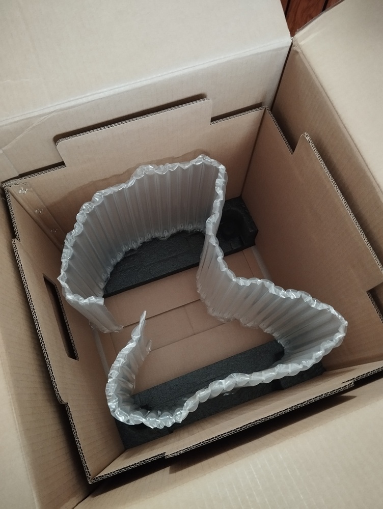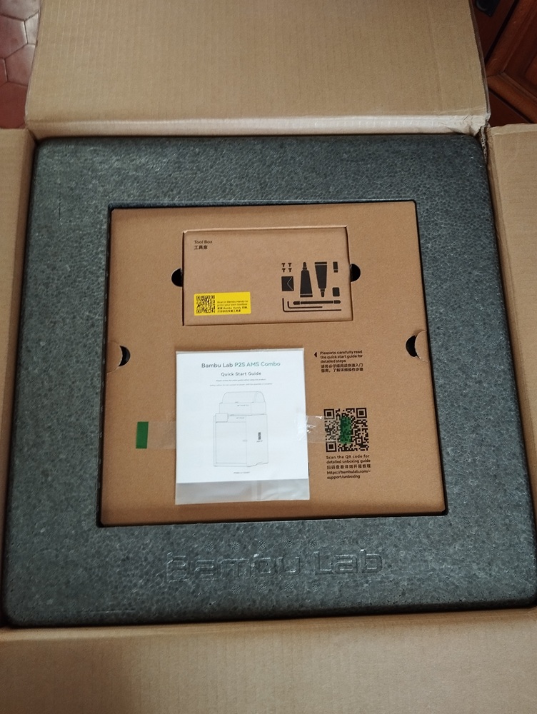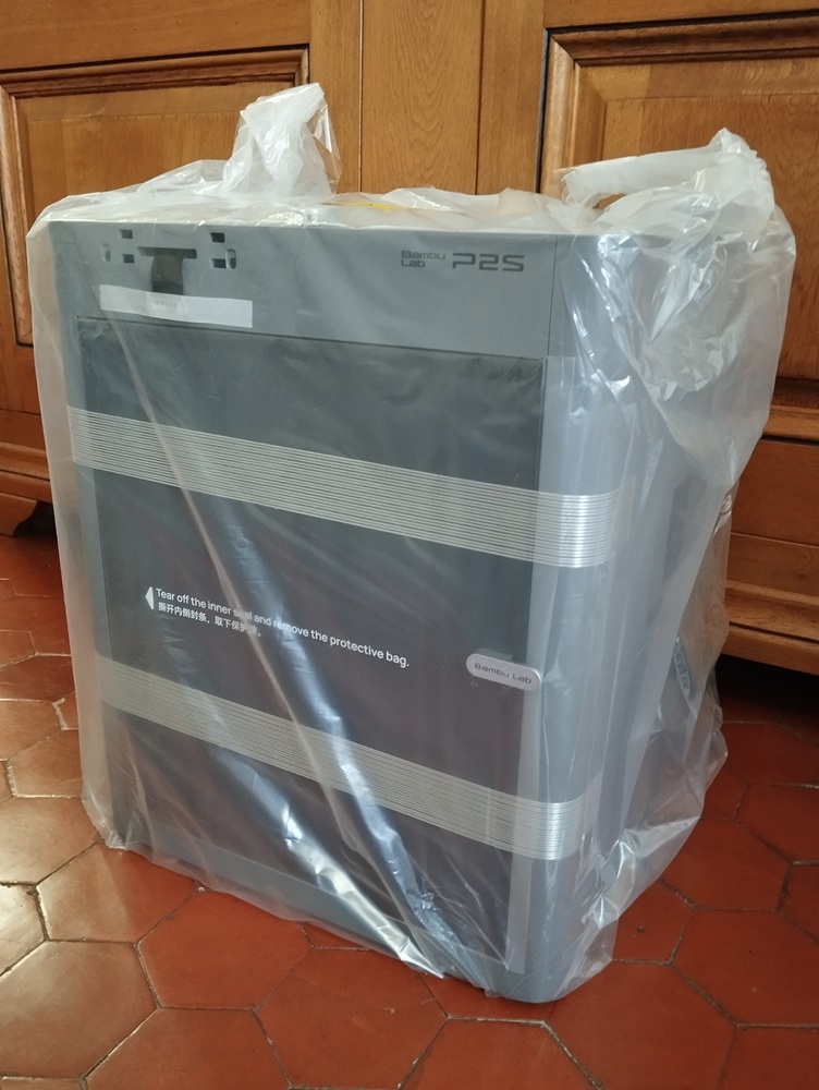 En premier lieu, j’ai été surpris par l’emballage. Un gros cadre en polystyrène au dessus, deux bandes de polystyrène en dessous, un sac et un plastique à grosses bulles autour de la P2S, un doublage de carton, le carton extérieur bien épais et c’est tout. Au début, j’ai trouvé ça léger par rapport à d’autres emballages d’imprimantes 3D et en y réfléchissant, c’est très bien pensé : c’est léger, solide et particulièrement efficace, la machine est très bien calée et bien protégée.