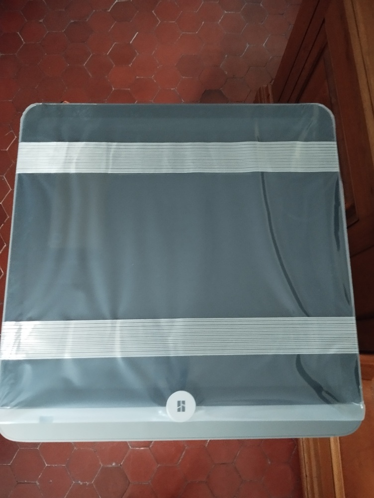 Une fois la machine sortie de son sac, on constate que la vitre du dessus et la porte sont protégées par des plastiques et le tout est fixé par des rubans adhésifs armés.