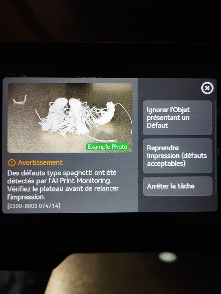 - Détection de spaghetti : même après avoir réglé la détection au plus haut niveau et après quatre essais, l’IA n’a rien mais détecté par contre elle a fait deux fausses alertes lors d’impression en TPU.