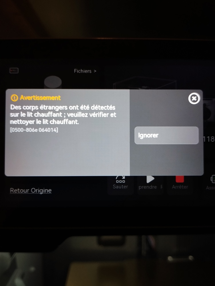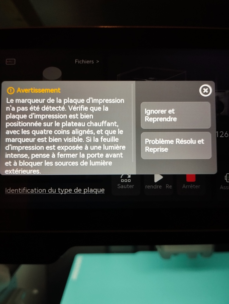 - Détection de la plaque d’impression : OK, j’ai essayé une plaque Cryogrip Pro Glacier qui n’a pas le petit code QR comme sur les plaques Bambu Lab, la P2S s’est mise en pause et a affiché une notification.