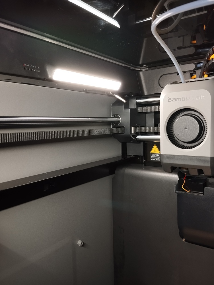 Le guidage est assuré sur tous les axes par des tiges lisses de 8 mm et des roulements linéaires, contrairement à la série P1 et X1 qui ont des tiges en carbone sur l’axe X. Bambu Lab a trouvé comme prétexte que les tiges lisses étaient plus facile à nettoyer que les tiges en carbone, c’est sûrement vrai mais pour ma part, je pense plutôt à une question d’économie tout en conservant une qualité d’impression optimale.
