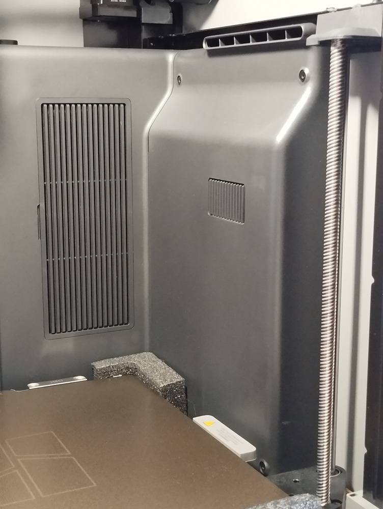 Il y a pour moi trois astuces que Bambu Lab a très bien su étudier et mis en œuvre. D’abord, le montage des cornières et leurs emplacements donne de la rigidité : le châssis en acier repose sur une embase en plastique de 3 mm d’épaisseur, des cornières forment tout le haut de l’imprimante et entre les deux, quatre cornières qui servent de montants sur toute la hauteur de la machine. Il y a également, sauf sur le devant, trois cornières horizontales aux trois quarts de l’imprimante qui servent à rigidifier le châssis.