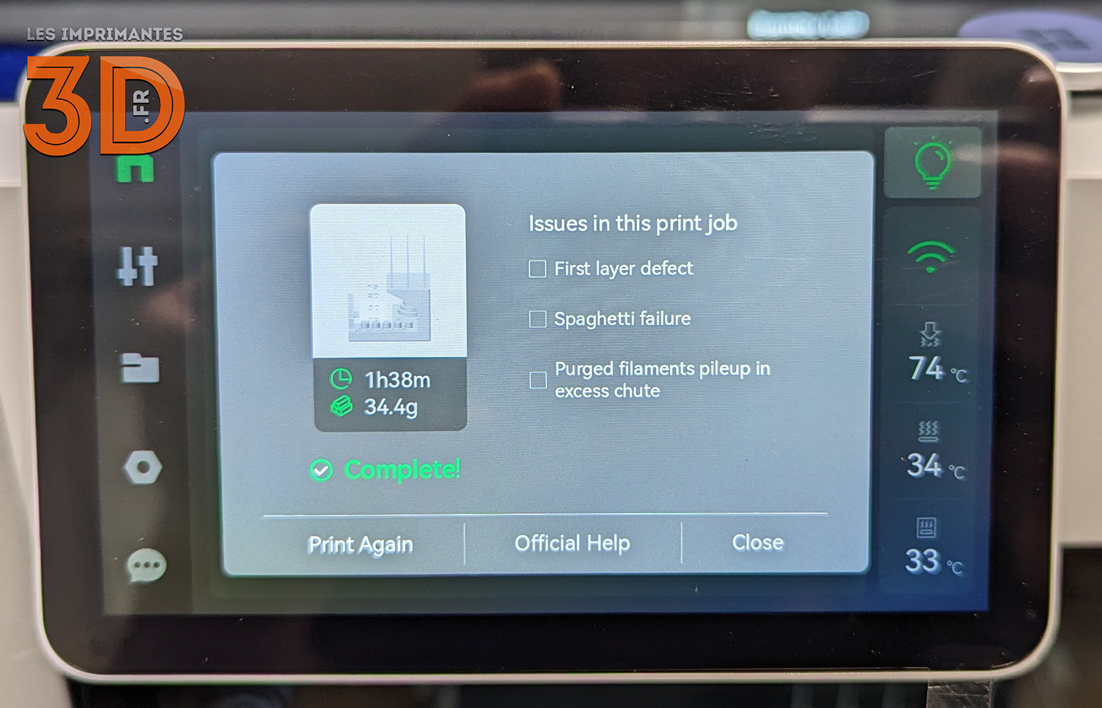 A la fin de l’impression, la durée et la quantité de filament estimée sont affichées. On peut également indiquer si on a rencontré un problème de première couche, de “spaghetti” ou de purge trop importante. On peut aussi relancer le même print au besoin.