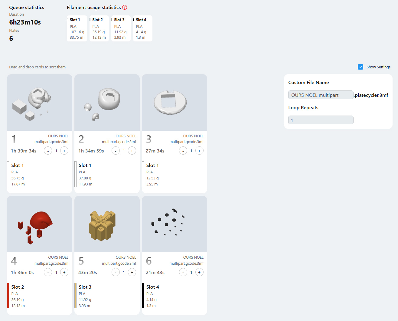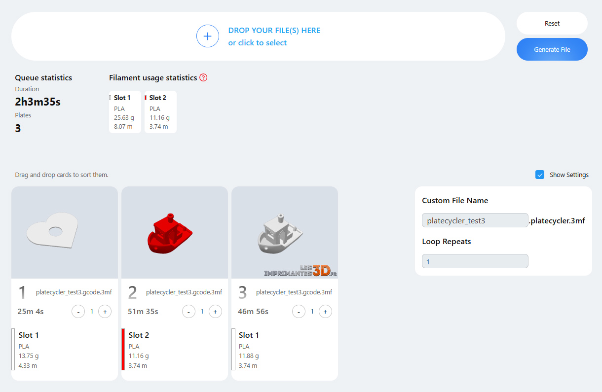 La suite se passe sur le site platecycler.chitusystems.com. On charge le fichier exporté du slicer pour organiser l’ordre d’impression des plateaux, vérifier les consommations estimées de matière, les durées d’impression, etc. On peut ensuite donner un nom personnalisé au fichier de sortie (“Custom File Name” qui se terminera par .platecycler.3mf) et on peut aussi imprimer plusieurs séries de la séquence (“Loop Repeats“). On clique enfin sur “Generate File” pour obtenir le fichier qui sera à fournir à l’imprimante, fichier 3MF implémenté du code spécifique pour gérer les changements automatisés de plateau.