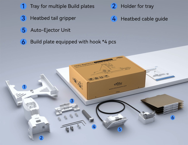Vous l’avez vu dans les vidéos ci-dessus, les PEI sont éjectés devant l’imprimante et se superposent, pouvant décoller les objets imprimés mais aussi les abimer ou créer un amoncellement qui pourrait bloquer le système. Pour éviter cela, Chitu propose d’imiter les fermes d’impression 3D en plaçant une boite devant la machine, en contrebas, avec de la mousse au fond, pour récupérer les plateaux.