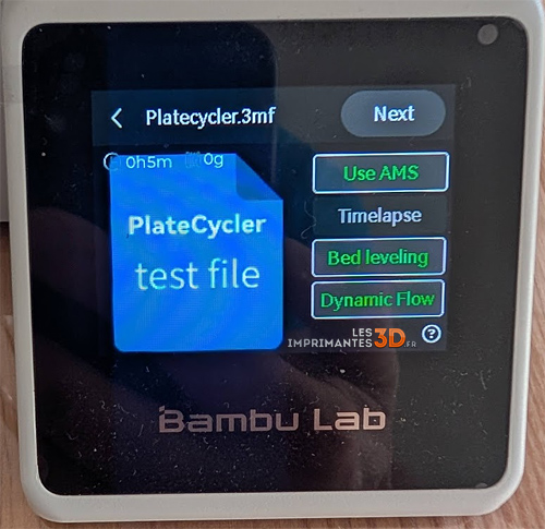 Pour rappel, la Bambu A1 peut lire les cartes micro SD, pas les clés USB, mais on peut aussi demander l’impression à distance du fichier PlateCycler en l’ouvrant dans Bambu Studio et l’imprimer directement (sans re-trancher).