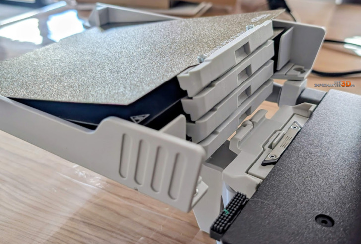 L’originalité de ce système réside dans son fonctionnement entièrement passif car il ne nécessite aucune connexion électronique supplémentaire ni moteur externe. Le mécanisme exploite les mouvements naturels des axes de l’imprimante Bambu Lab pour déclencher le changement de support. Lorsqu’une impression est terminée, un levier va libérer le plateau magnétique utilisé qui est alors éjecté vers l’avant de la machine, tandis qu’un nouveau plateau vierge descend du chargeur par gravité pour prendre sa place sur le lit chauffant. Ce PEI est ensuite “tiré” pour prendre place sur le lit et l’impression se poursuivra.