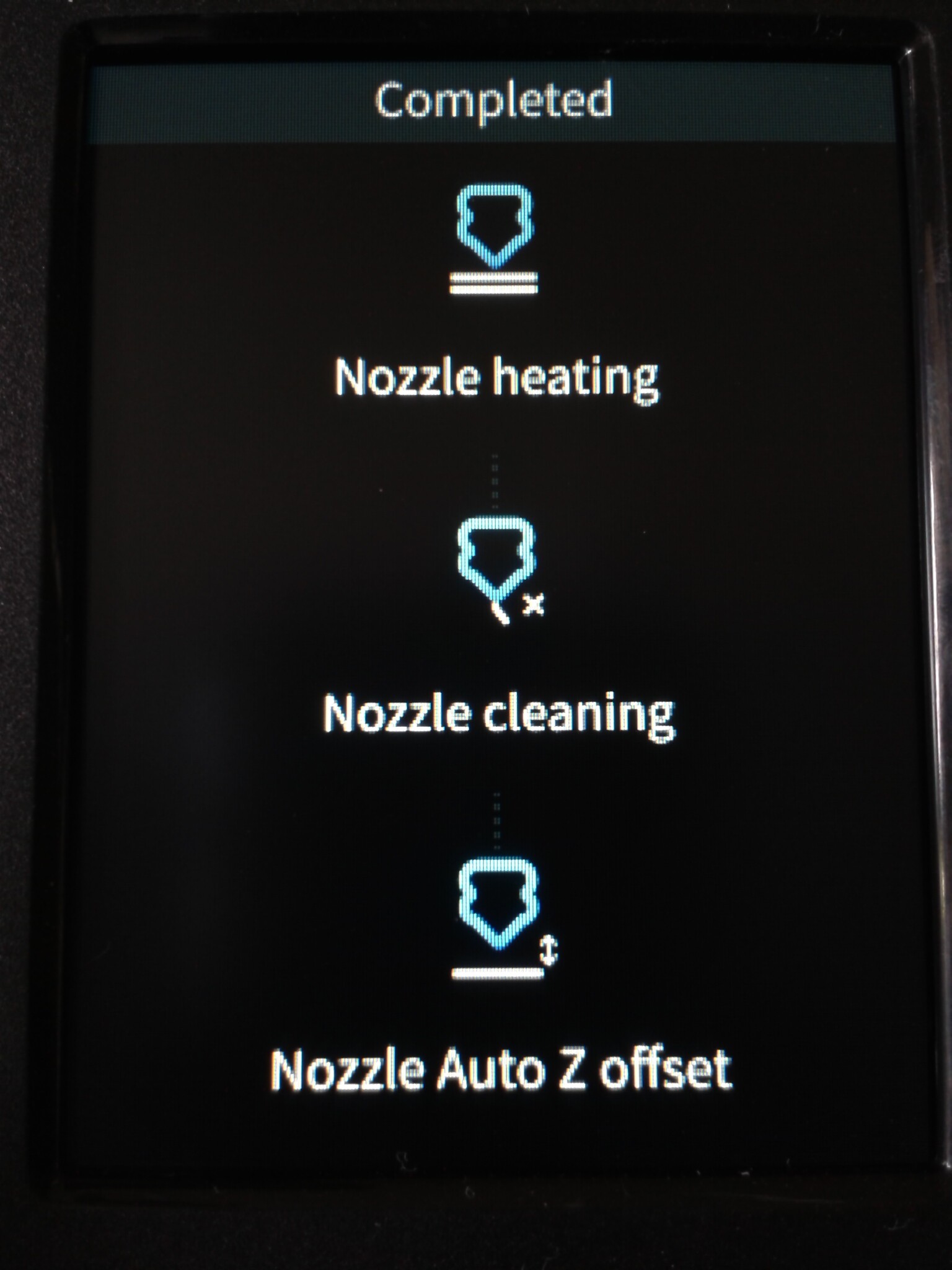 Donc, si la température n’était pas suffisante pour purger, quand revenue à température d’impression, je pousse manuellement le nouveau filament, avant d’appuyer de nouveau sur l’icône de reprise qui fait sortir de la position de “park” et reprend l’impression.