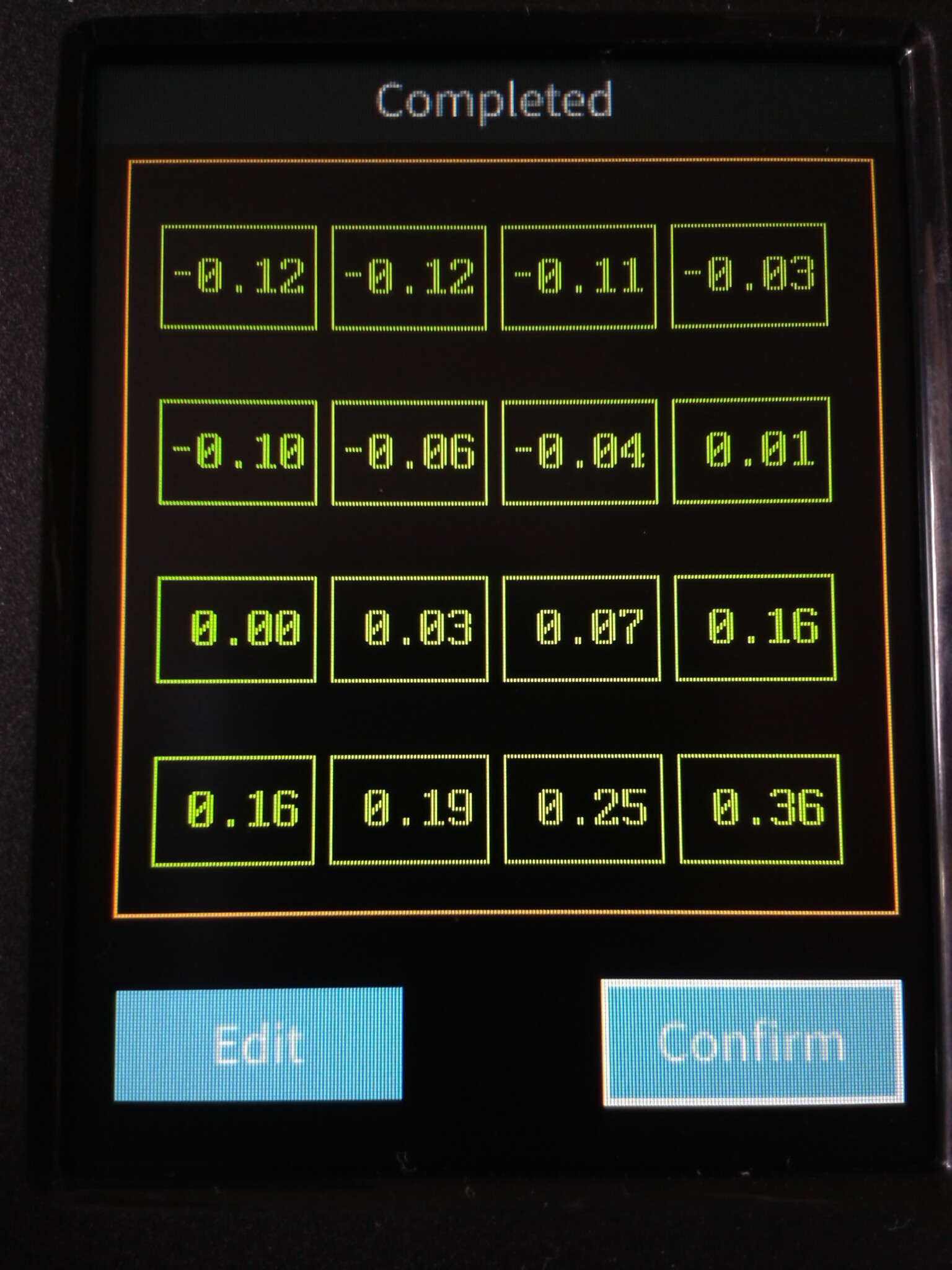 Ensuite, lancer la procédure de Leveling qui va automatiquement, en quelques minutes, mettre en chauffe, déterminer la valeur du Z-Offset et effectuer 16 points de mesure sur la surface du plateau. Les résultats sont affichés et l’assistant demander une confirmation de ces valeurs.