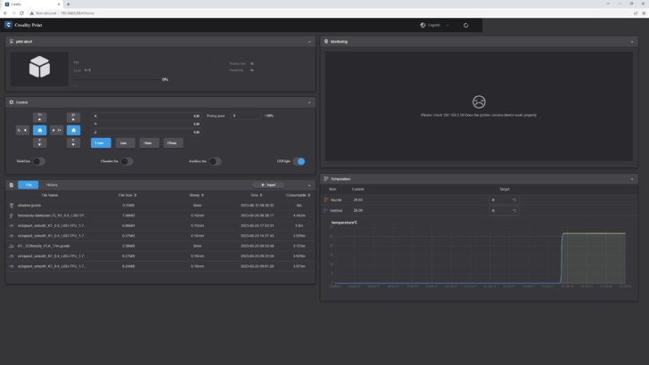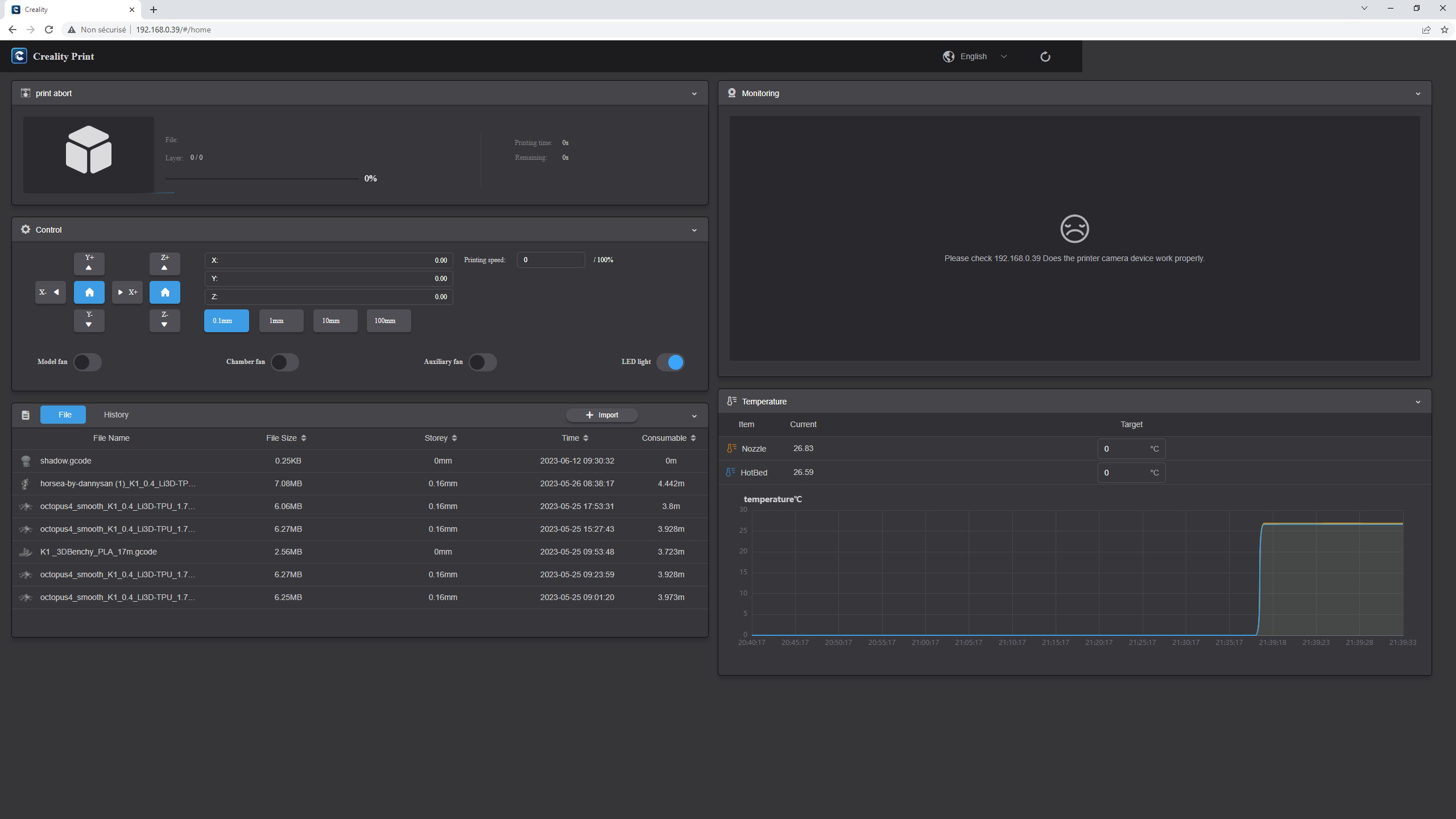 Mais aussi depuis l’interface web embarquée qui permet donc d’envoyer et exécuter les Gcodes conçus avec d’autres slicers :