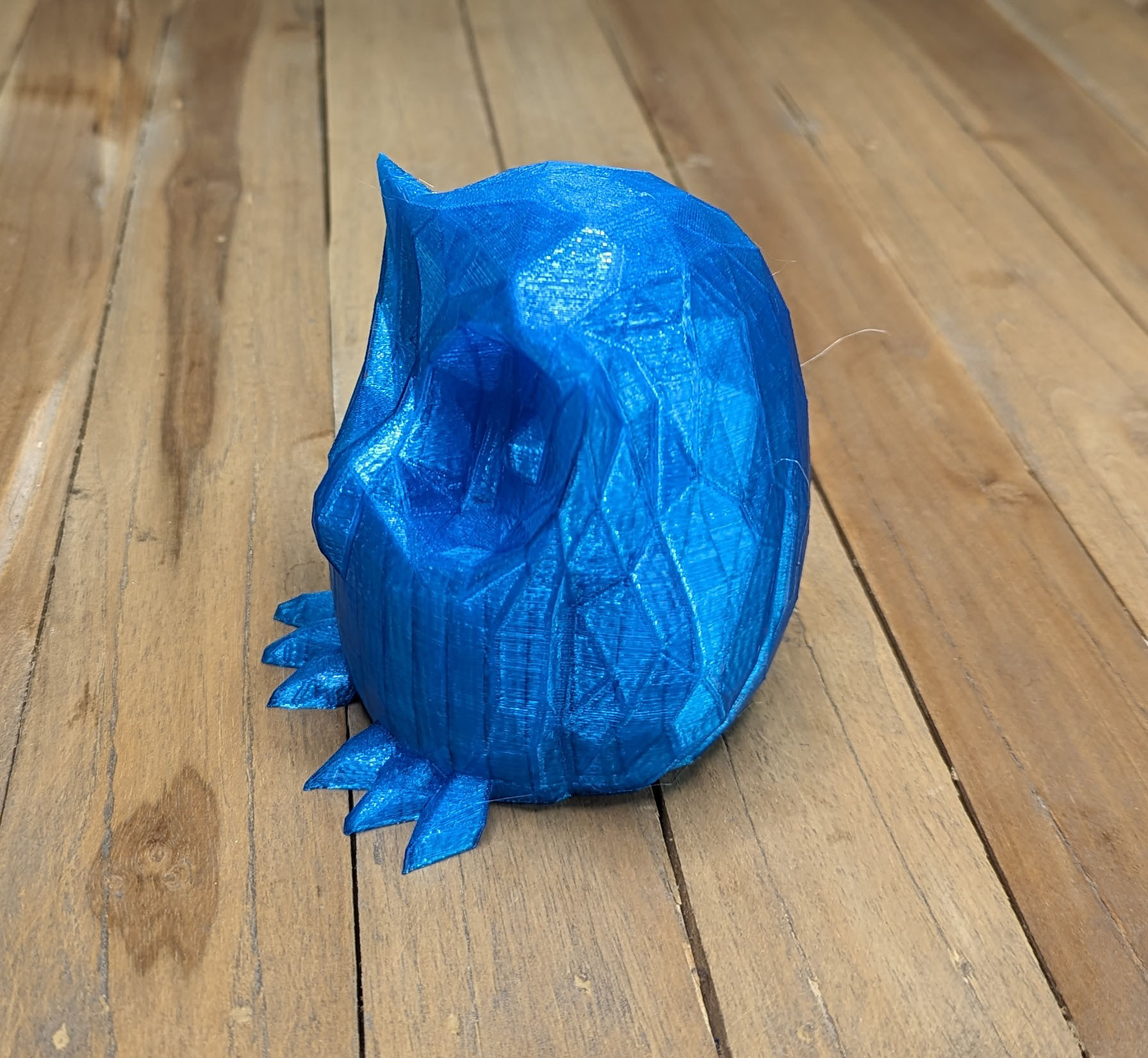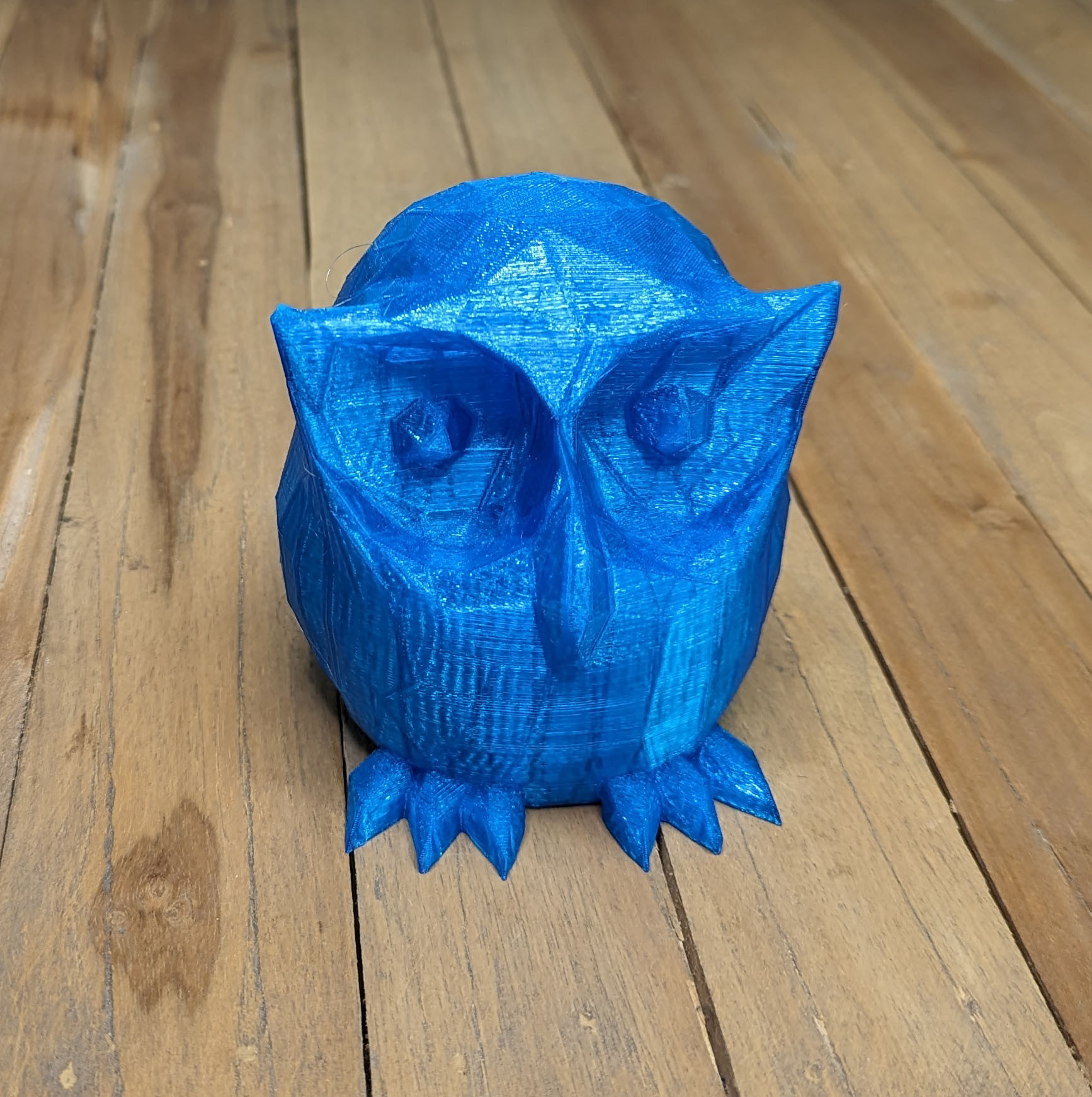 J’ai donc enchaîné avec un plus gros objet : ce hibou “low poly” (dont le modèle a disparu de Printables) imprimé en 3h28 avec une qualité irréprochable :