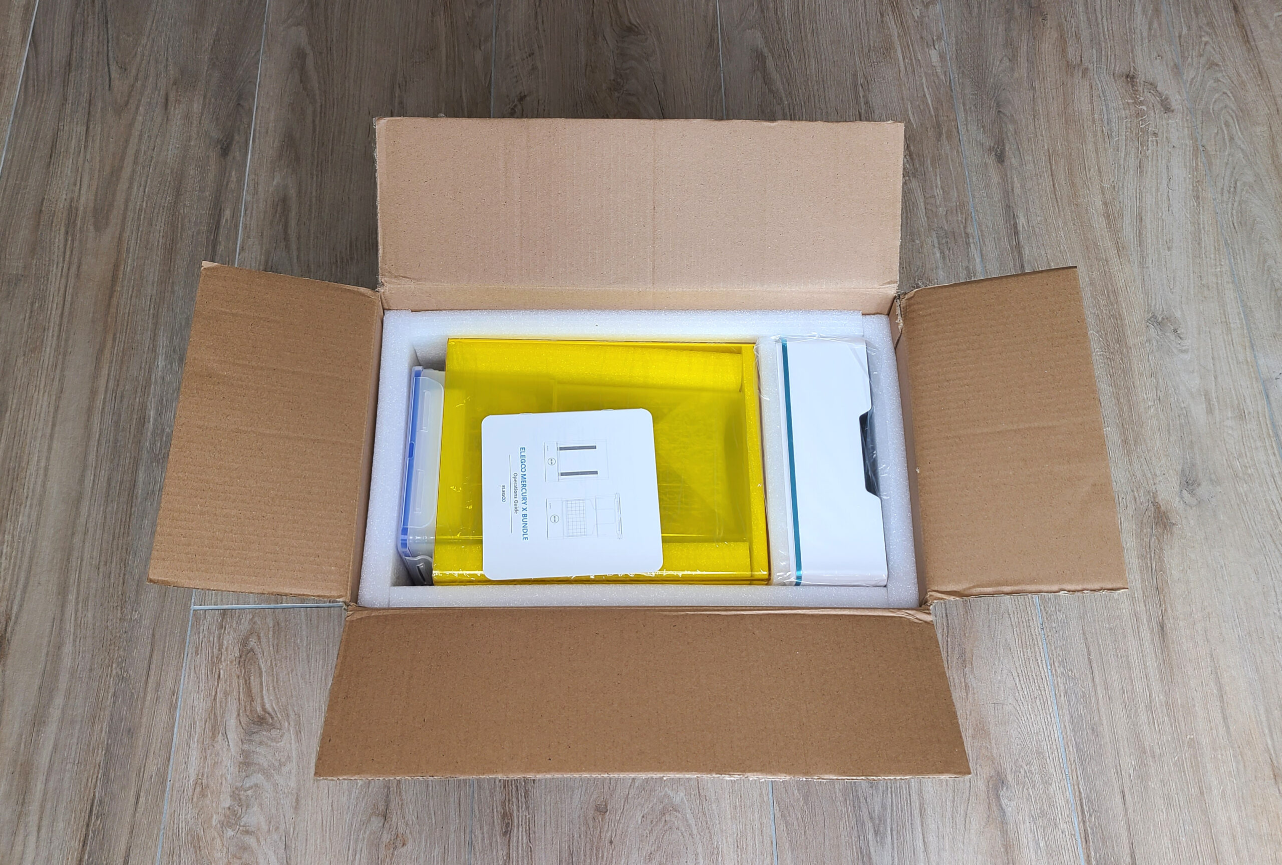 La machine est très bien protégée dans un carton peu encombrant. A ces côtés, on retrouve une petite boite qui contient tout le nécessaire au montage, à l’utilisation et à l’entretien de l’imprimante. Il manque juste une bouteille de résine pour être opérationnel.