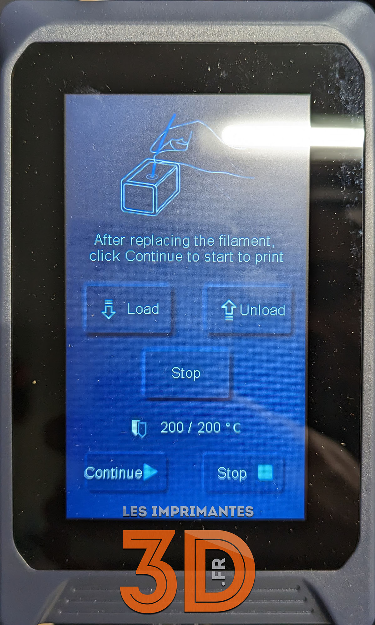 Il ne reste plus qu’à allumer la “printeuse” avec le bouton situé à côté de la prise d’alimentation sur la tranche droite du châssis. Elle est d’ailleurs compatible 100 – 240V, donc pas de réglage de tension à effectuer contrairement à ce qu’indique le sticker de protection de l’écran de contrôle. A son démarrage, l’imprimante n’émet absolument aucun bruit. Tous les ventilateurs sont éteints et seul l’éclairage de l’écran témoigne de la mise en route.