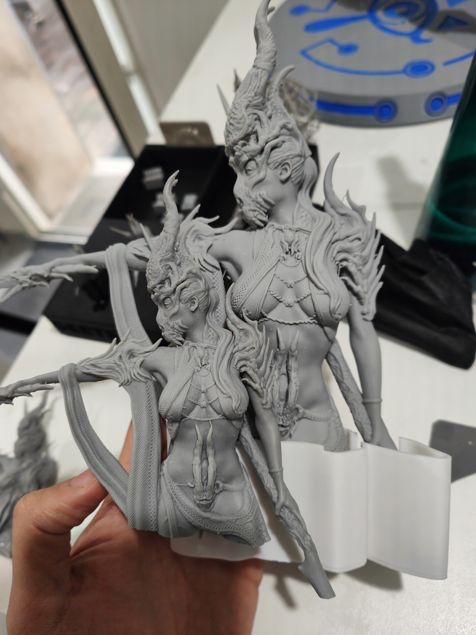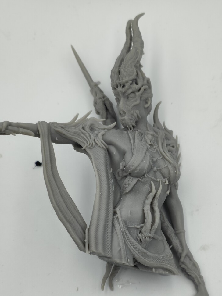 J’ai commencé les tests d’impression par mon habituel benchmark avec de la résine standard grise, que j’ai pu comparer avec les mêmes prints sur la Elegoo Saturn 3 Ultra et la Phrozen mini 8KS. Malgré une résolution XY de 51 microns, les deux figurines côte à côte ne sont pas si évidente à différencier. Il faudra une analyse assez longue pour réellement déterminer à l’œil quelle imprimante offre la meilleure qualité. Bien entendu, la Geeetech Alkaid 2K ne peut pas rivaliser avec ses deux concurrentes mais elle n’a pas à rougir. Nous parlons d’une différence par pixels de 0,025 mm, il faudra ainsi regarder de très près sa pièce ou aimer la prendre en photo macro pour se dire qu’elle pourrait être mieux, ce qui sera encore moins perceptible une fois vos pièces peintes comme je l’explique dans la vidéo en fin de page.