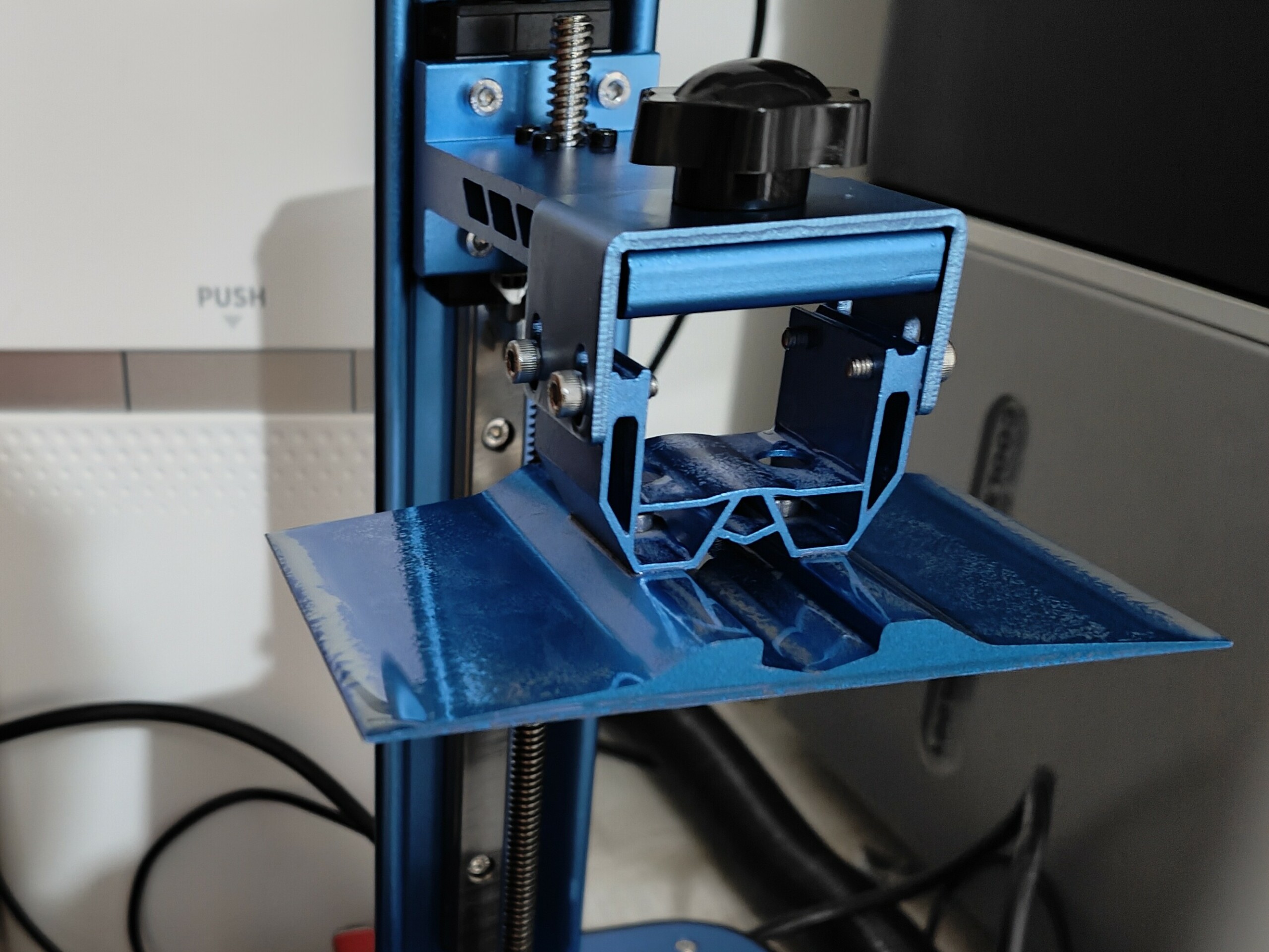 Le bac gradué dispose d’un bec verseur peu pratique et n’a aucun moyen pratique de le glisser facilement, il faudra manuellement l’approcher des emplacements prévus pour les vis de fixation. A noter que les FEP pour la Geeetech Alkaid sont des modèles propriétaires qui ont l’avantage d’être plus rapides à changer mais nécessitent d’acheter les produits du constructeur (pas de fabricant tiers). Les deux vis de fixation ont un très petit diamètre, ne rendant pas aisé leur manipulation.