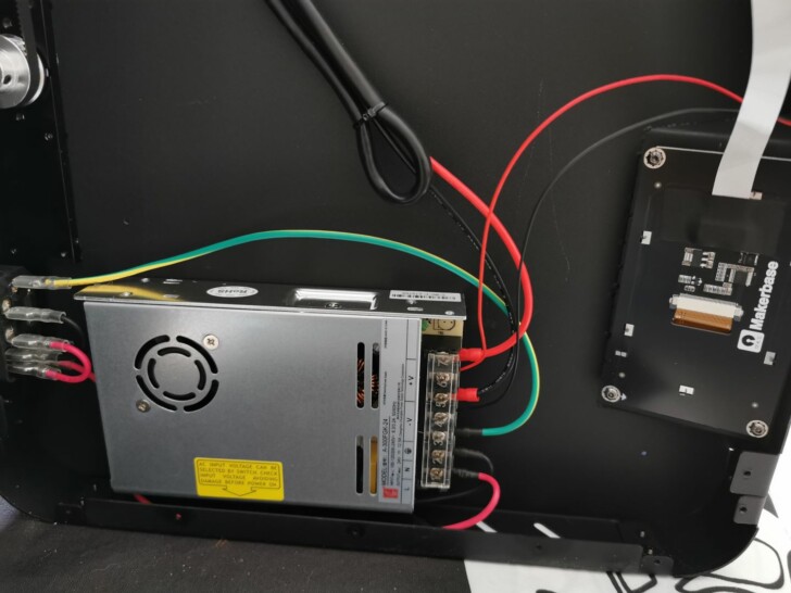 L’imprimante est équipée d’une alimentation 24V de 12.5A soit 300W, ce qui me semble un peu juste compte tenu du plateau chauffant 24V supportant 100°C et la buse 300°C. Mais le plus surprenant est que cette dernière est deux fois plus compacte que l’alimentation 24V 360W d’une FLsun SR par exemple.