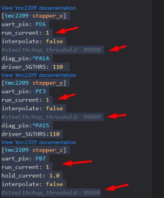 Plus grave encore selon moi, dans le fichier de configuration printer.cfg, en plus de l’absence de macro utile comme le M600, l’ajustement des courants de drivers moteurs X / Y / Z n’est pas adapté. En effet, le “Run Current” est définit à 1.3A là où la documentation Klipper explique clairement que les drivers TMC2209 ne doivent jamais avoir une valeur de courant supérieure à 1.2A. En réalité, 1A suffit amplement en Run Current pour ces axes.