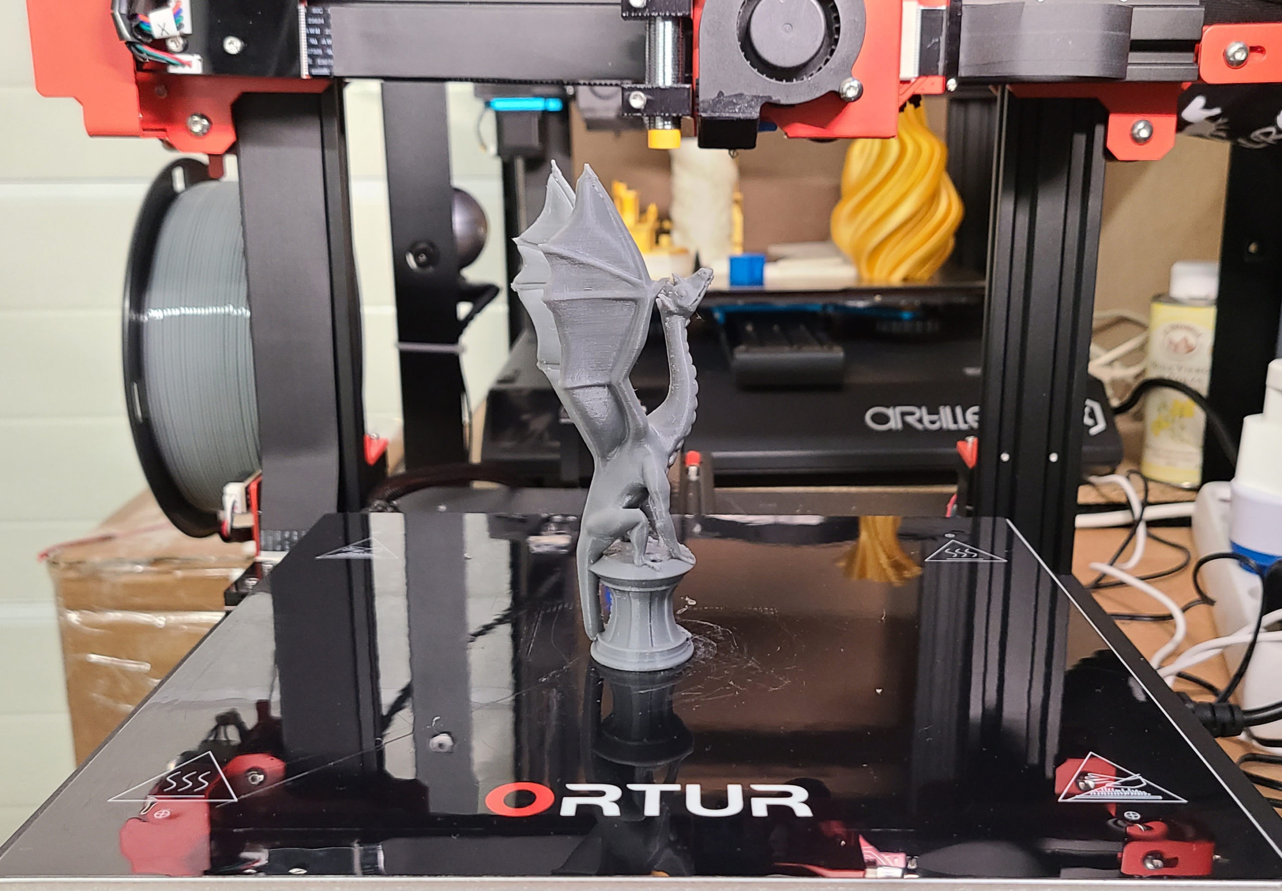 Après avoir bataillé avec des bugs liés au firmware de la machine que j’ai dû mettre à jour grâce aux fichiers fournis sur le site officiel dédié à l’Obsidian, j’ai pu lancer l’impression d’un des deux seuls fichiers présents sur la carte SD de ma version “anticipée” de l’imprimante 3D :