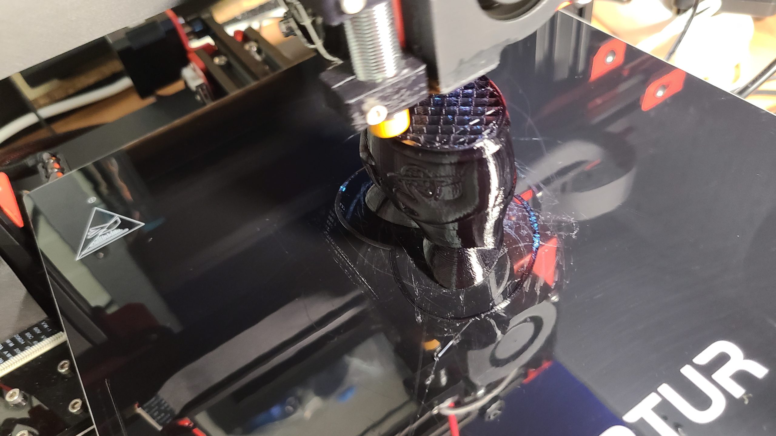La pièce est très clean, sans support avec un remplissage uniforme mais malheureusement le filament s’est coincé au niveau du capteur à cause d’un bourrelet…