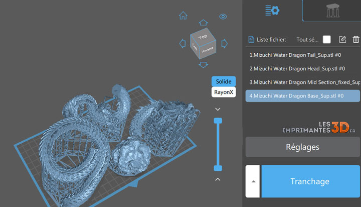 Le constructeur vend deux slicers, Phrozen Dental Synergy Slicer (DS Slicer) et Phrozen 3D mais les prix sont dissuasifs. J’ai donc utilisé Chitubox en version gratuite, logiciel réputé en SLA.