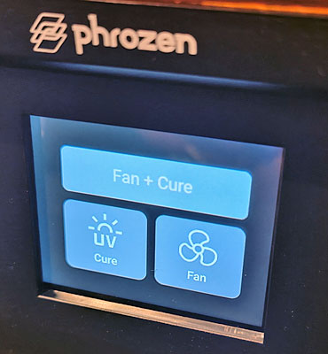 L’interface du boitier “Cure” avec écran tactile reprend celle de l’imprimante Sonic Mighty 8K, facile à prendre en main avec les options de Fan (ventilation) et de Cure (séchage).