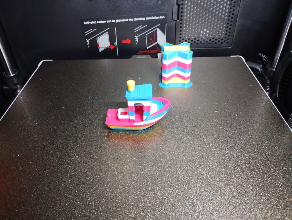 Comme c’est un modèle qui nécessite pas mal de filament, c’était l’occasion de tester la fonction de continuité d’impression en plaçant deux bobines du même matériau et même couleur dans le boitier multifilaments. Quand la première bobine de PLA Ziro Twinkling black a été épuisée, l’impression s’est mise en pause le temps de charger la seconde, puis l’impression a repris.