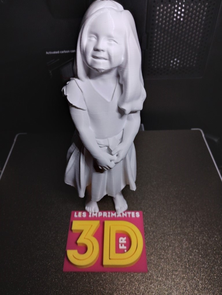 Incroyable qu’à partir d’une simple photo de face, l’IA soit capable de reconstituer le volume… je suis bluffé et un peu réconcilié avec l’utilisation de l’IA. Si j’avais le courage et que j’accepte de gâcher du filament, une mise en couleur serait un plus (là je vais laisser ma fille peindre sa fille, elle est bien plus douée que moi).