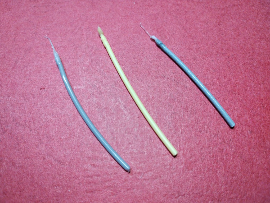 Lors du retrait du filament, malgré une coupe au-dessus de l’extrudeur, le filament qui ressort n’est pas net, il reste un morceau effiloché. Trois morceaux de filament différents (PETG gris, PLA jaune, PLA gris) :