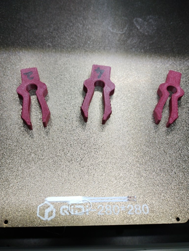L’adaptateur de petite bobine étant imprimé, il me permet d’utiliser du PETG-CF. Retirer des fiches JST d’une carte est parfois pénible, d’où l’impression de ces trois outils (pince 2, 3, 4 broches)
