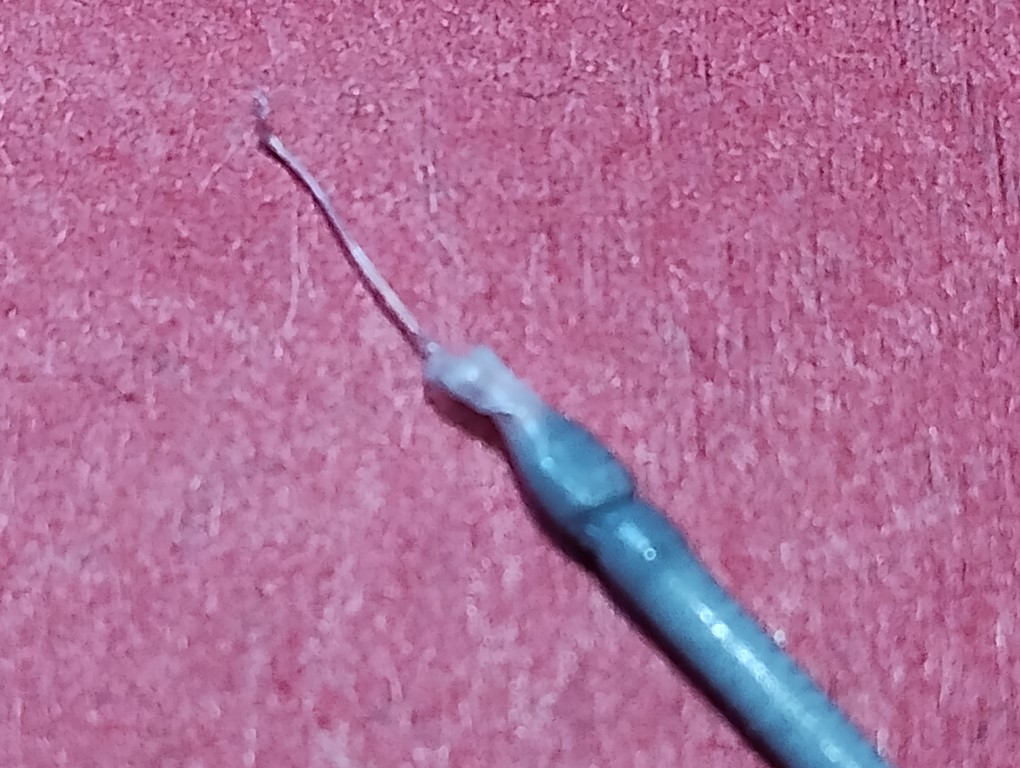 Pensant que la lame de coupe était émoussée, je l’ai remplacée par une neuve (j’avais du stock acheté pour le cas où). Malgré ce remplacement, le problème est toujours là. Ces petits bouts de filaments ont fini par s’accumuler dans le PTFE qui va du hub à la tête créant une obstruction.