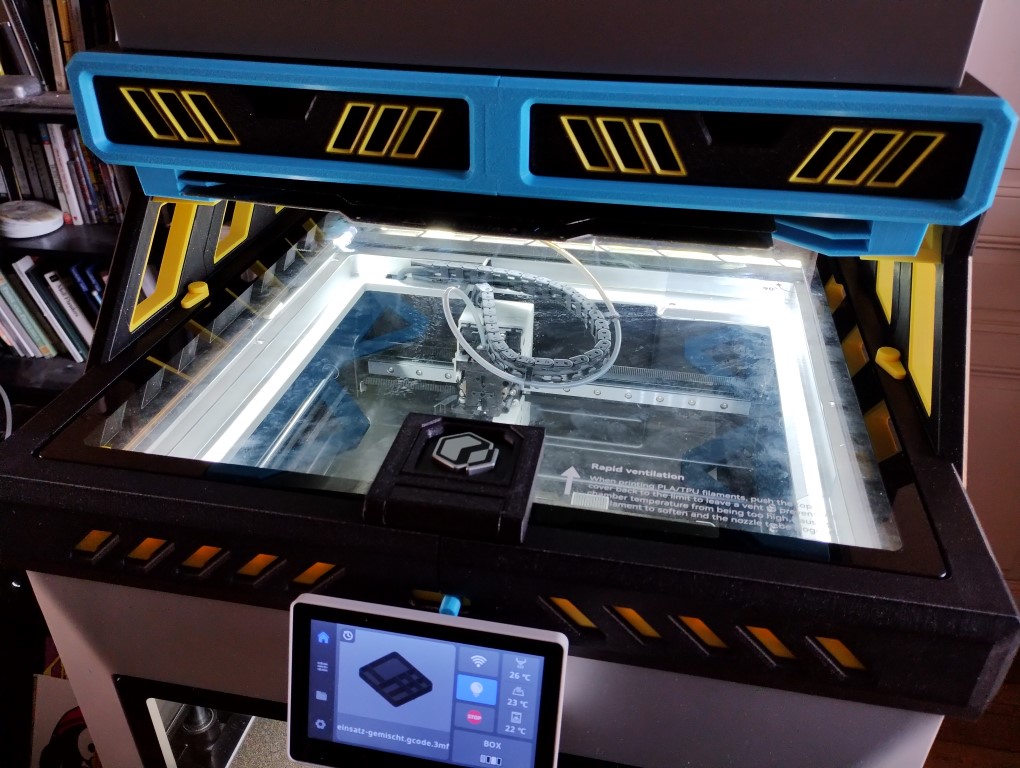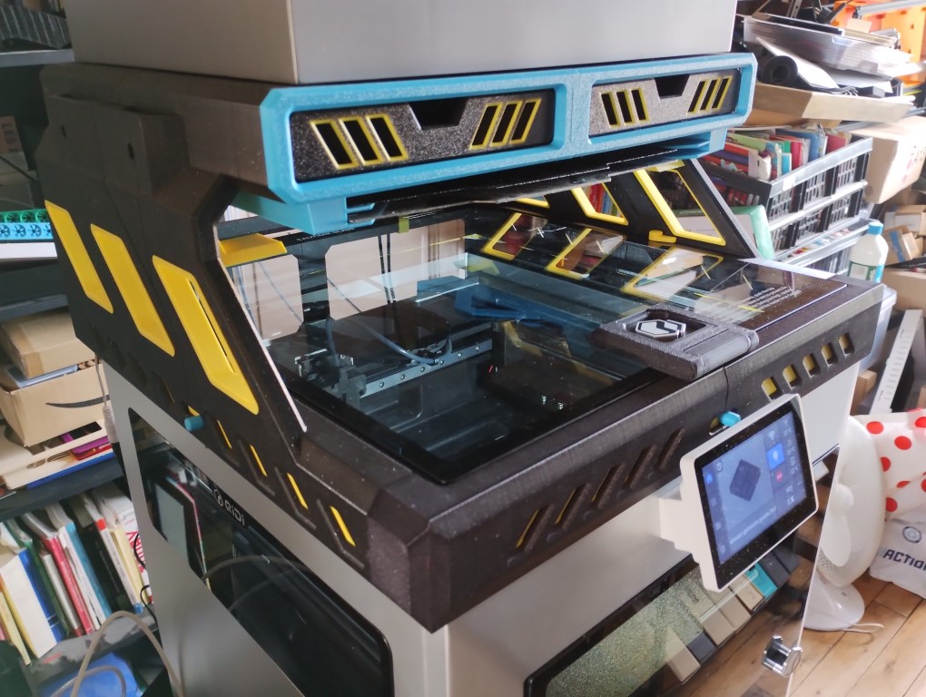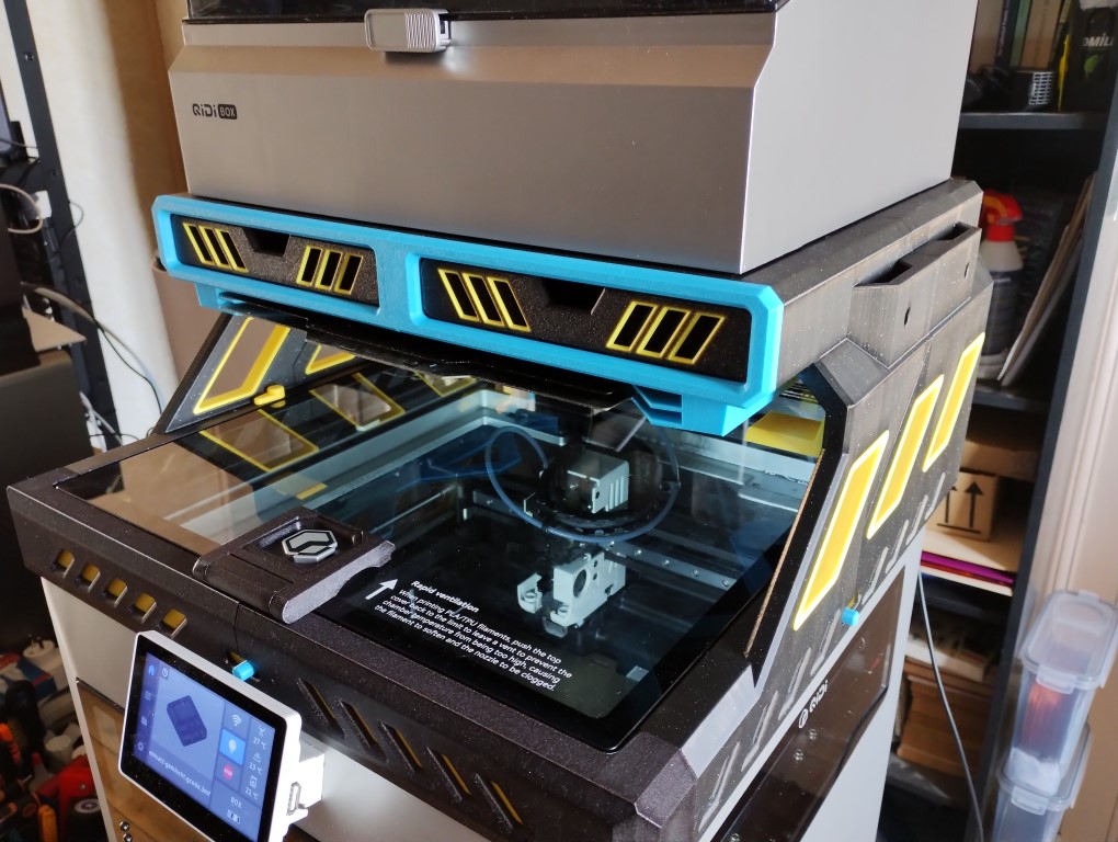 J’ai donc investi dans un modèle payant que je trouve plus seyant et qui apporte d’autres fonctionnalités : possibilité d’ajouter un bandeau de LEDs sur l’ensemble du pourtour (l’éclairage interne originel de la Q2 n’est pas des plus performant), support de plateaux, tiroirs.
