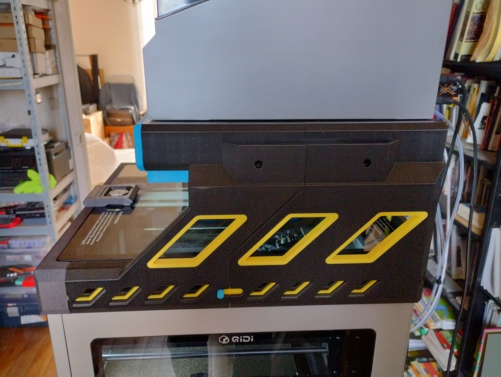 Toutefois, avec la Qidi Box posée sur la Q2, l’ouverture est moins aisée (≃ 8 kg avec quatre bobines pleines). Dans ce cas, il est préférable d’ouvrir les obturateurs (ouïes d’aération) situés de chaque côté pour permettre à l’air chaud interne de s’évacuer par convection.