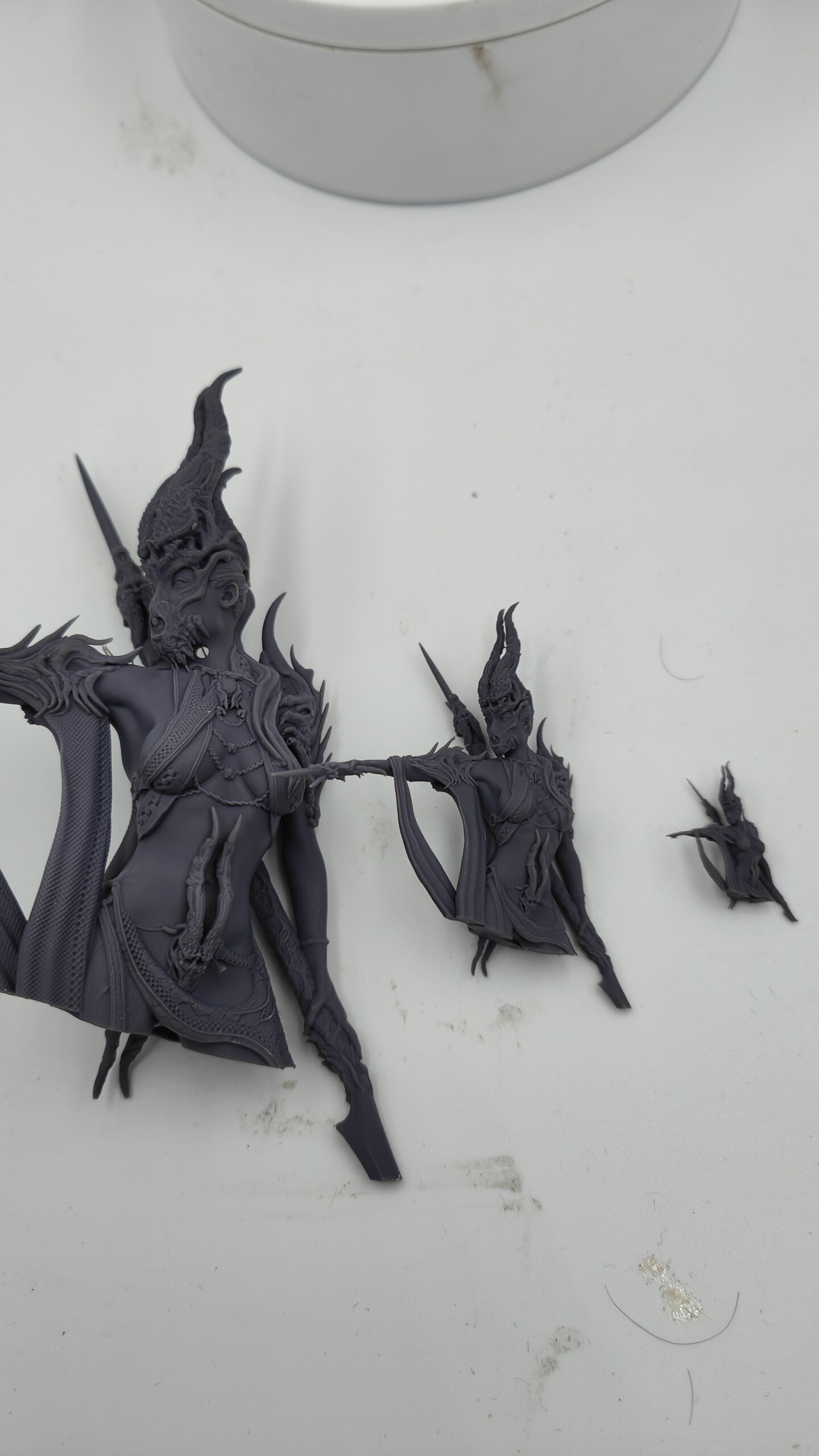 A gauche sur la photo ci-dessous, un print avec de la résine Anycubic standard ; au milieu le mélange de ratio 1 pour 8 ; à droite, un sujet imprimé à 100% en Sunlu Standard 14K.