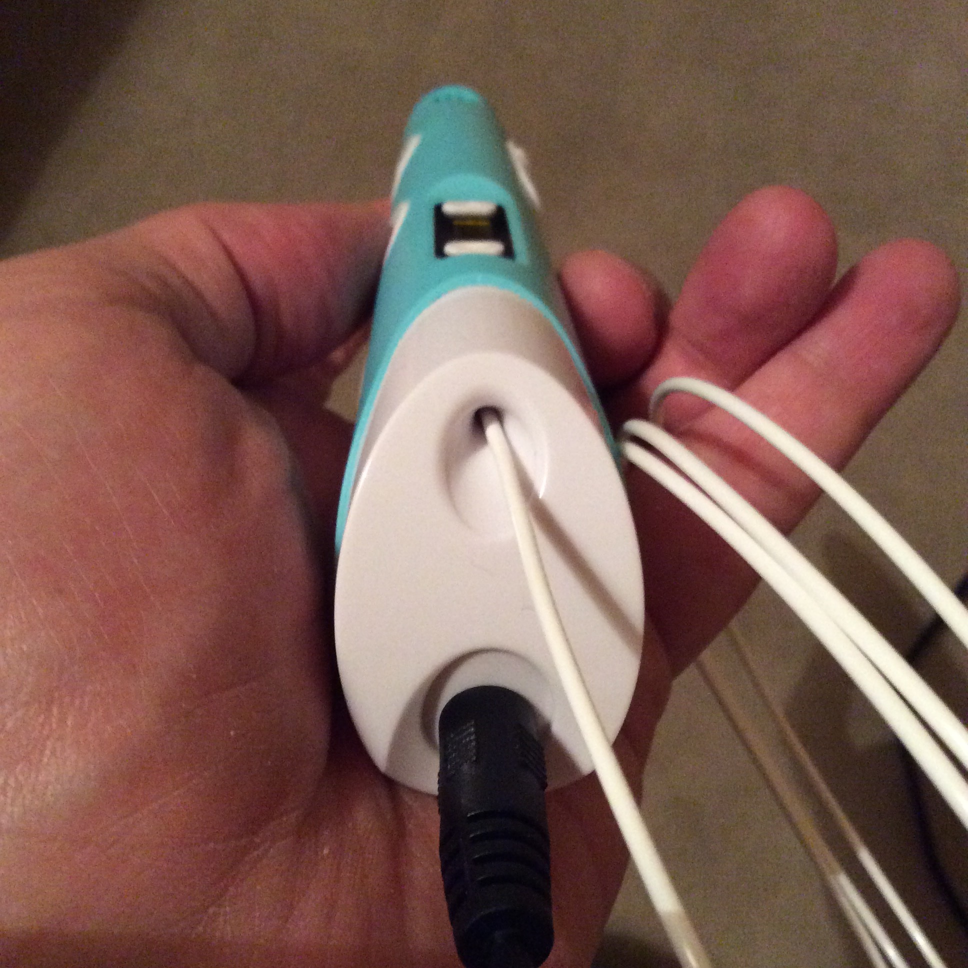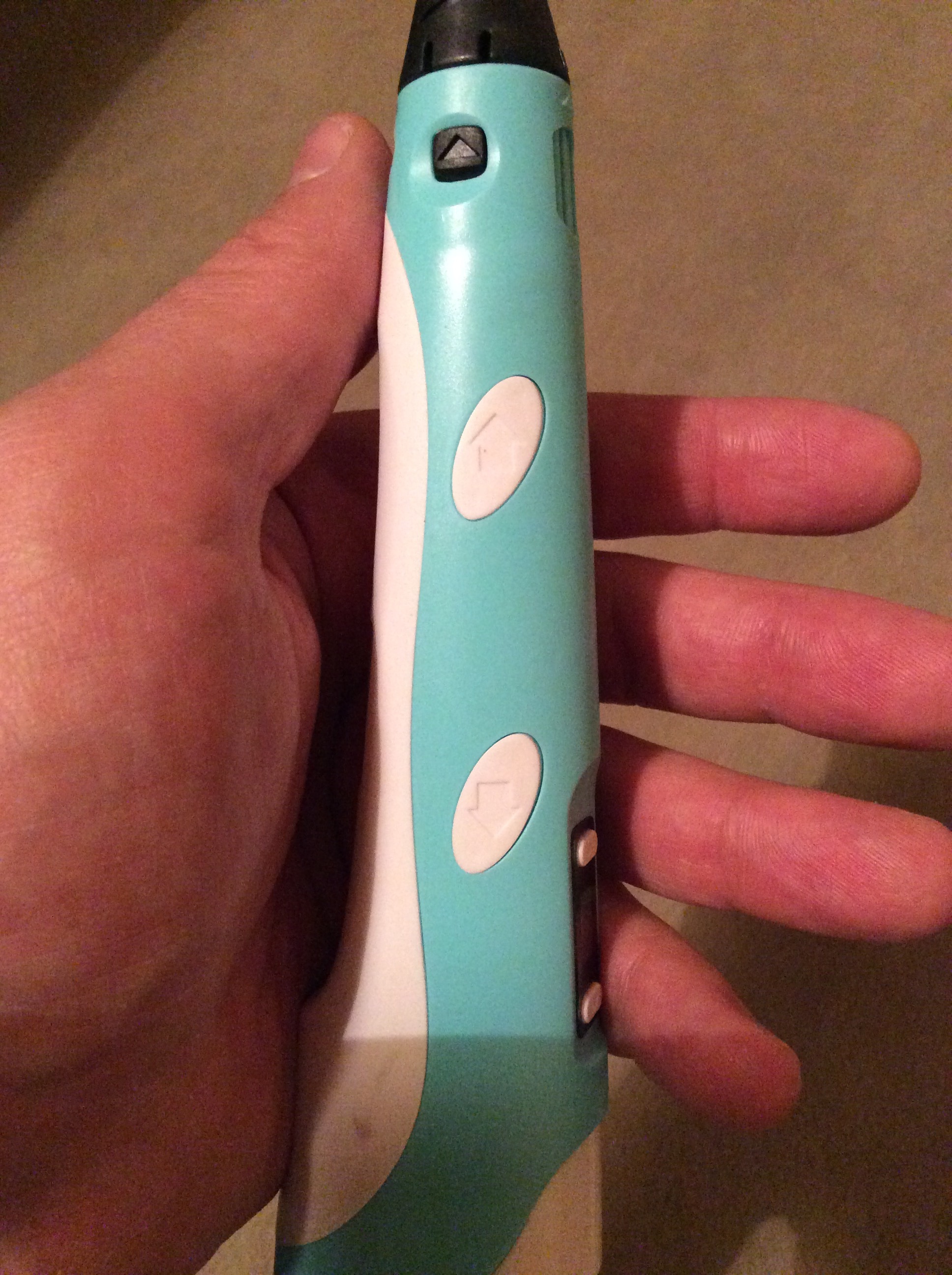 Une fois la buse à la bonne température, il faut ensuite insérer le fil jusqu’à celle-ci. Pour cela, on insère le filament à l’arrière et on le fait avancer le fil dans le stylo avec le bouton de gauche sur le côté.