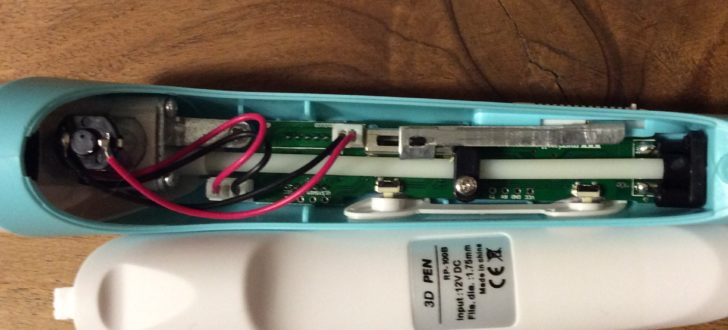 Le fonctionnement global d’un stylo 3D est ma foi assez simpliste : le filament est coincé entre un roulement à bille et une roue d’entrainement actionnée par un moteur. Le filament est guidé jusqu’à la buse par un tube. Au contact de la buse, chauffée par une résistance, le plastique fond. Ce dernier sort par la buse à un diamètre imposé bien inférieur à celui du filament. Le plastique en sortie est donc assez fin et il se durcit très rapidement au contact de l’air ambiant.