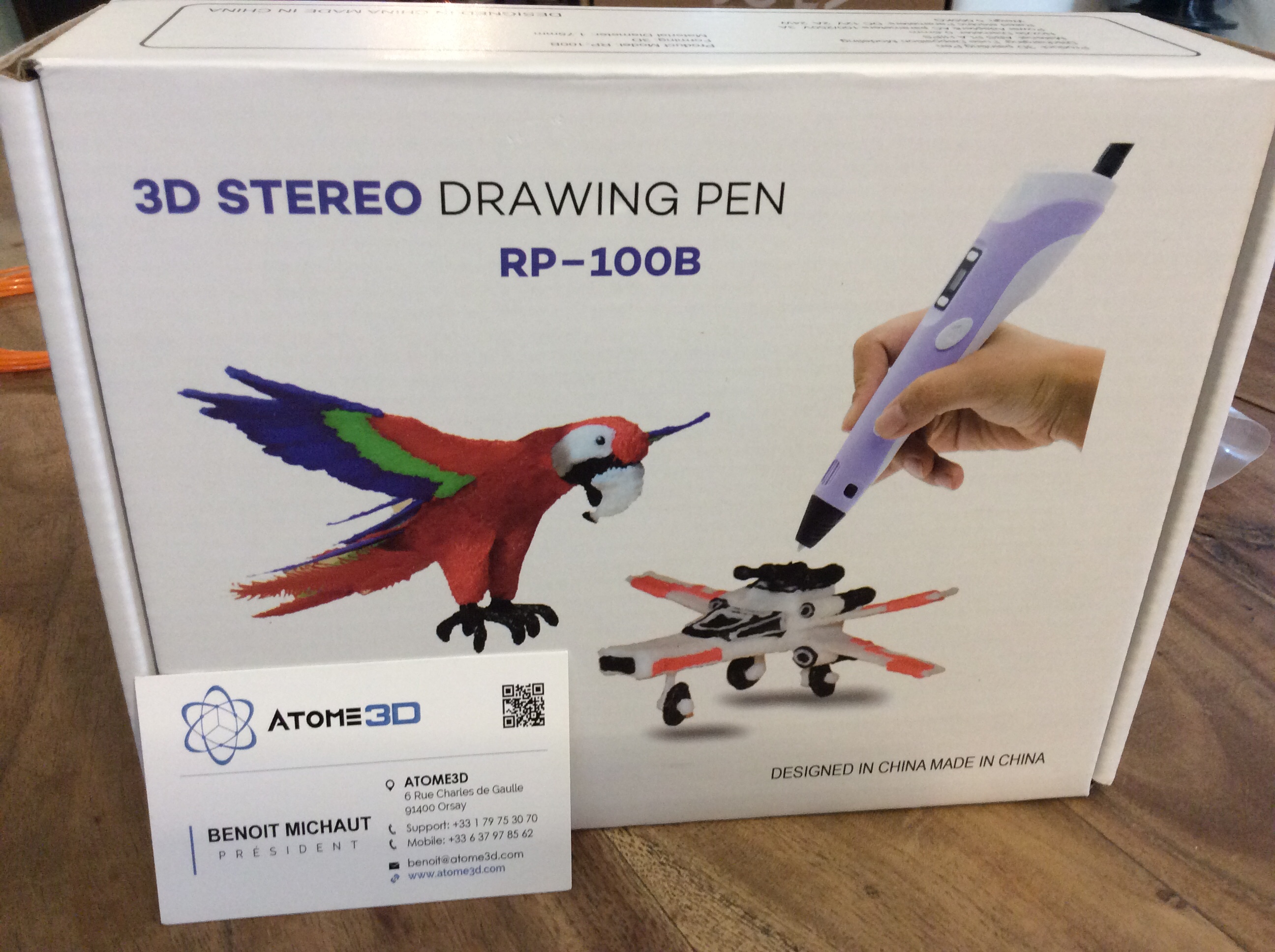 Le Stylo3D que nous a fourni Atome3D a le code RP-100B. Il est livré dans une boite qui nous laisse rêveur avec des images de réalisation d’un vaisseau StarWars et d’un joli perroquet. On n’est pas dupe, on sait très bien que la route est longue et que persévérance il nous faudra avant d’en arriver là.
