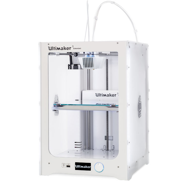La version Extended se différencie de l’Ultimaker 3 “classique” par son volume d’impression plus important. La base du plateau est toujours de 215 x 215 mm mais la hauteur passe à 300 mm, autorisant ainsi des créations plus conséquentes. Cette machine reprend les autres caractéristiques de l’UM3, à savoir son double extrudeur Print Core, les connectivités USB – Ethernet – Wi-Fi – NFC, les bobines de 2,85mm et la précision d’impression. Là aussi, c’est le logiciel Open Source Cura qui se chargera de piloter l’imprimante. L’Ultimaker 3 est l’une des plus silencieuses du marché avec seulement 50 dB en fonctionnement.