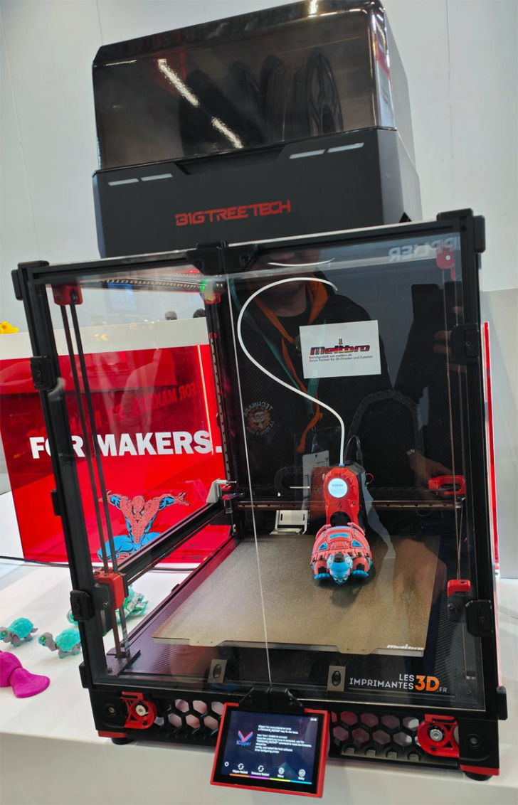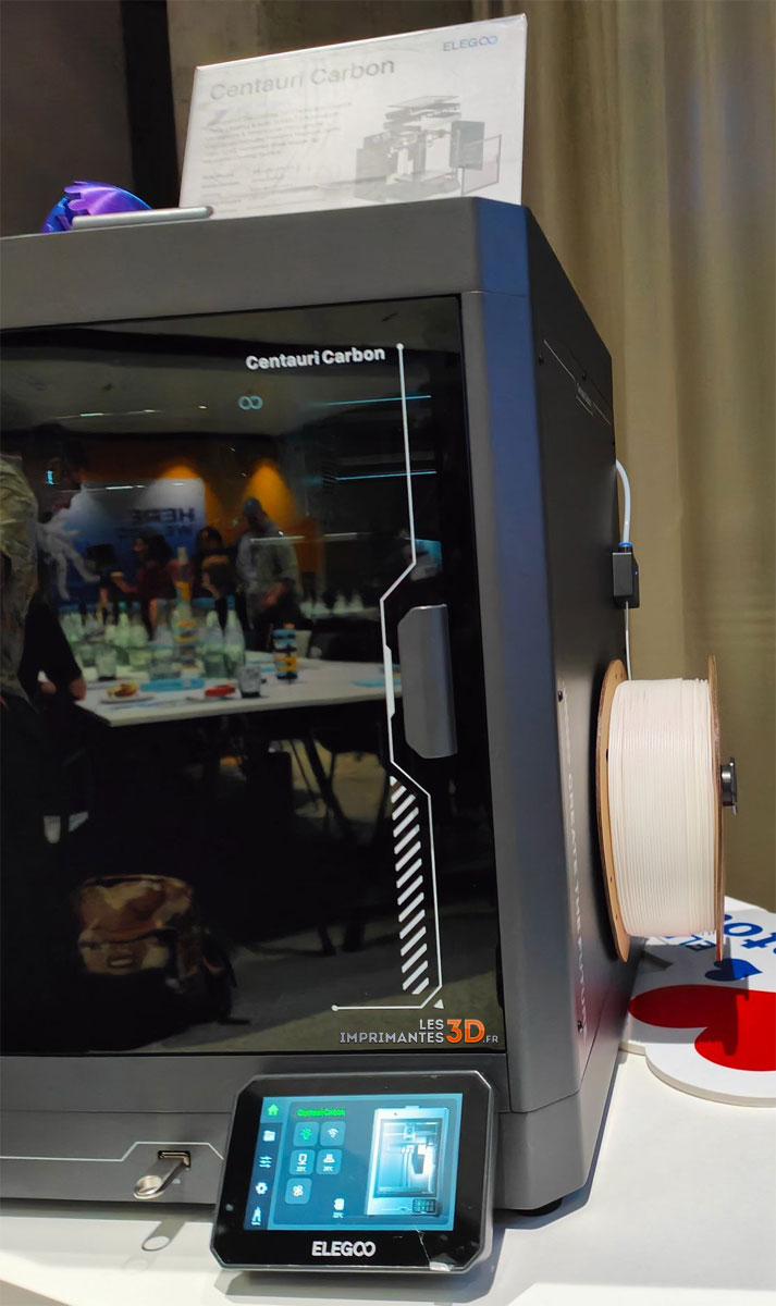 La CoreXY Centauri Carbon était bien sûr de la partie sur le stand Elegoo et une présentation a eu lieu. On est face à un presque clone de la Bambu Lab X1C avec le même volume d’impression (256 x 256 x 256 mm), température de buse 320°C, caméra AI, un LiDAR, écran en bas et bobine déportée sur le côté. On a hâte de savoir quand la machine sera commercialisée et à quel prix car ces informations n’ont pas encore été dévoilées, tout comme la disponibilité d’un système multi-filaments type AMS.